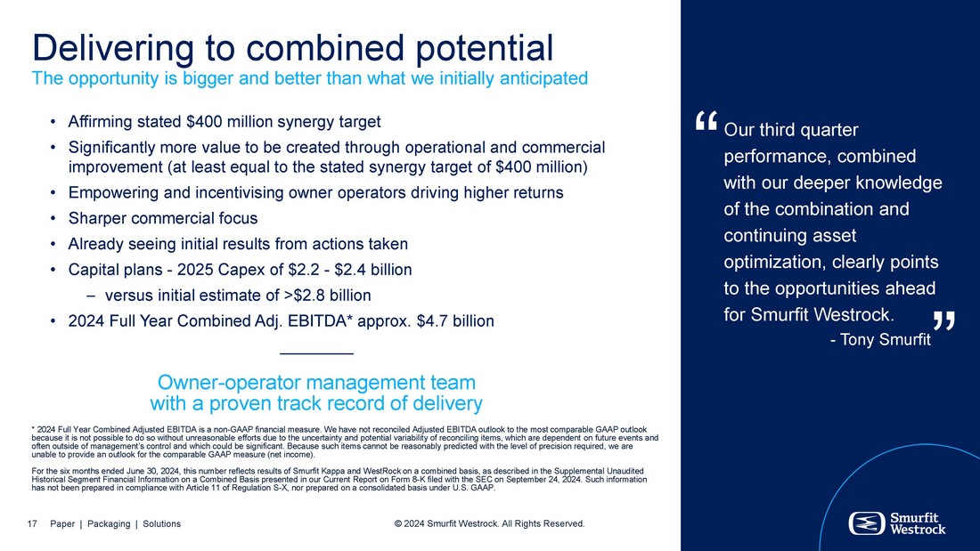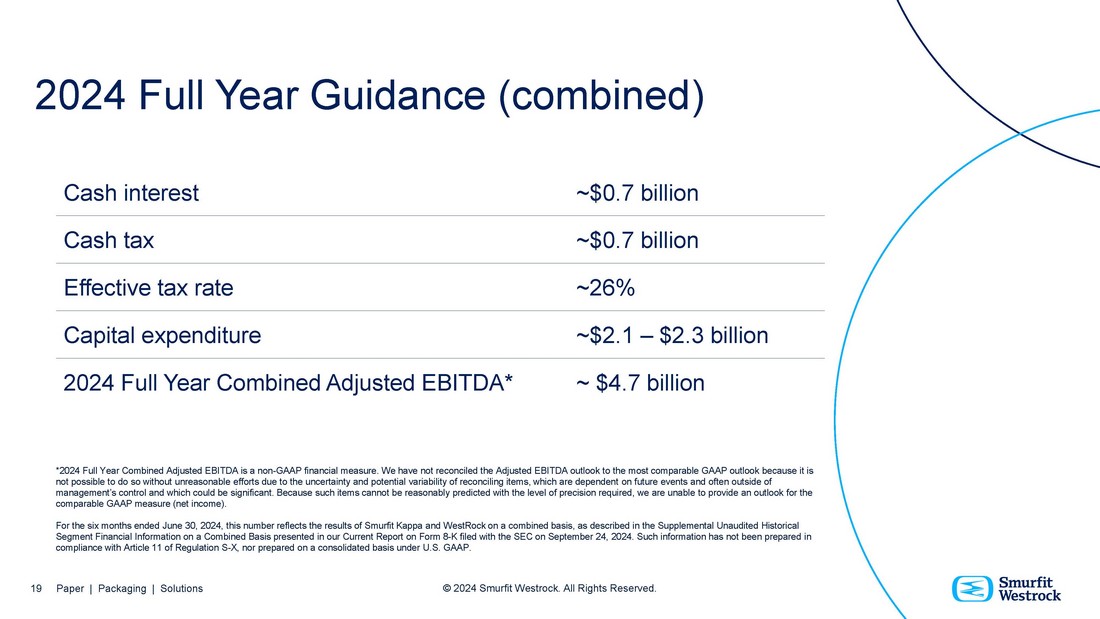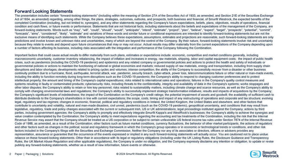 Forward Looking Statements The presentation includes certain “forward - looking statements” (including within the meaning of Section 27A of the Securities Act of 1933, as amended, and Section 21E of the Securities Exchange Act of 1934, as amended) regarding, among other things, the plans, strategies, outcomes, outlooks, and prospects, both business and financial, of Smurfit Westrock, the expected benefits of the completed Combination (including, but not limited to, synergies), and any other statements regarding the Company's future expectations, beliefs, plans, objectives, results of operations, financial condition and cash flows, or future events or performance. Statements that are not historical facts, including statements about the beliefs and expectations of the management of the Company, are forward - looking statements. Words such as “may”, “will”, “could”, “should”, “would”, “anticipate”, “intend”, “estimate”, “project”, “plan”, “believe”, “expect”, “target”, “prospects”, “potential”, “commit”, “forecasts”, “aims”, “considered”, “likely”, “estimate” and variations of these words and similar future or conditional expressions are intended to identify forward - looking statements but are not the exclusive means of identifying such statements. While the Company believes these expectations, assumptions, estimates and projections are reasonable, such forward - looking statements are only predictions and involve known and unknown risks and uncertainties, many of which are beyond the control of the Company. By their nature, forward - looking statements involve risk and uncertainty because they relate to events and depend upon future circumstances that may or may not occur. Actual results may differ materially from the current expectations of the Company depending upon a number of factors affecting its business, including risks associated with the integration and performance of the Company following the Combination. Important factors that could cause actual results to differ materially from such plans, estimates or expectations include: economic, competitive and market conditions generally, including macroeconomic uncertainty, customer inventory rebalancing, the impact of inflation and increases in energy, raw materials, shipping, labor and capital equipment costs; the impact of public health crises, such as pandemics (including the COVID - 19 pandemic) and epidemics and any related company or governmental policies and actions to protect the health and safety of individuals or governmental policies or actions to maintain the functioning of national or global economies and markets; reduced supply of raw materials, energy and transportation, including from supply chain disruptions and labor shortages; developments related to pricing cycles and volumes; intense competition; the ability of the Company to successfully recover from a disaster or other business continuity problem due to a hurricane, flood, earthquake, terrorist attack, war, pandemic, security breach, cyber - attack, power loss, telecommunications failure or other natural or man - made events, including the ability to function remotely during long - term disruptions such as the COVID - 19 pandemic; the Company's ability to respond to changing customer preferences and to protect intellectual property; the amount and timing of the Company's capital expenditures; risks related to international sales and operations; failures in the Company's quality control measures and systems resulting in faulty or contaminated products; cybersecurity risks, including threats to the confidentiality, integrity and availability of data in the Company's systems; works stoppages and other labor disputes; the Company's ability to retain or hire key personnel; risks related to sustainability matters, including climate change and scarce resources, as well as the Company's ability to comply with changing environmental laws and regulations; the Company's ability to successfully implement strategic transformation initiatives; results and impacts of acquisitions by the Company; the Company's significant levels of indebtedness; the impact of the Combination on the Company's credit ratings; the potential impairment of assets and goodwill; the availability of sufficient cash to distribute dividends to the Company's shareholders in line with current expectations; the scope, costs, timing and impact of any restructuring of operations and corporate and tax structure; evolving legal, regulatory and tax regimes; changes in economic, financial, political and regulatory conditions in Ireland, the United Kingdom, the United States and elsewhere, and other factors that contribute to uncertainty and volatility, natural and man - made disasters, civil unrest, pandemics (such as the COVID - 19 pandemic), geopolitical uncertainty, and conditions that may result from legislative, regulatory, trade and policy changes associated with the current or subsequent Irish, US or UK administrations; legal proceedings instituted against the Company; actions by third parties, including government agencies; the Company's ability to promptly and effectively integrate Smurfit Kappa's and WestRock's businesses; the Company's ability to achieve the synergies and value creation contemplated by the Combination; the Company's ability to meet expectations regarding the accounting and tax treatments of the Combination, including the risk that the Internal Revenue Service may assert that the Company should be treated as a US corporation or be subject to certain unfavorable US federal income tax rules under Section 7874 of the Internal Revenue Code of 1986, as amended, as a result of the Combination; other factors such as future market conditions, currency fluctuations, the behavior of other market participants, the actions of regulators and other factors such as changes in the political, social and regulatory fra