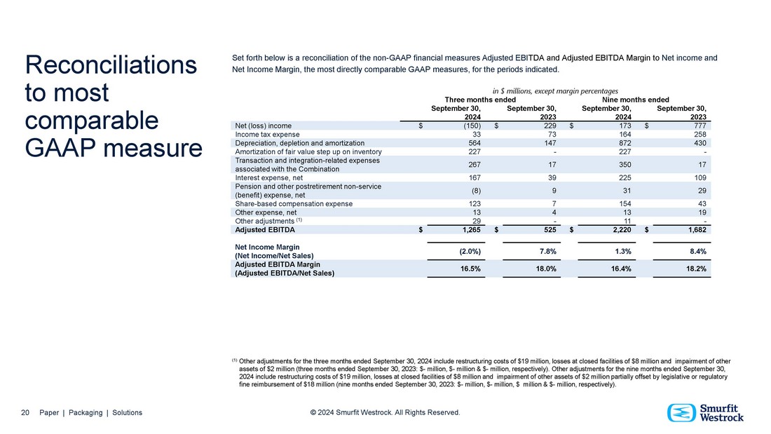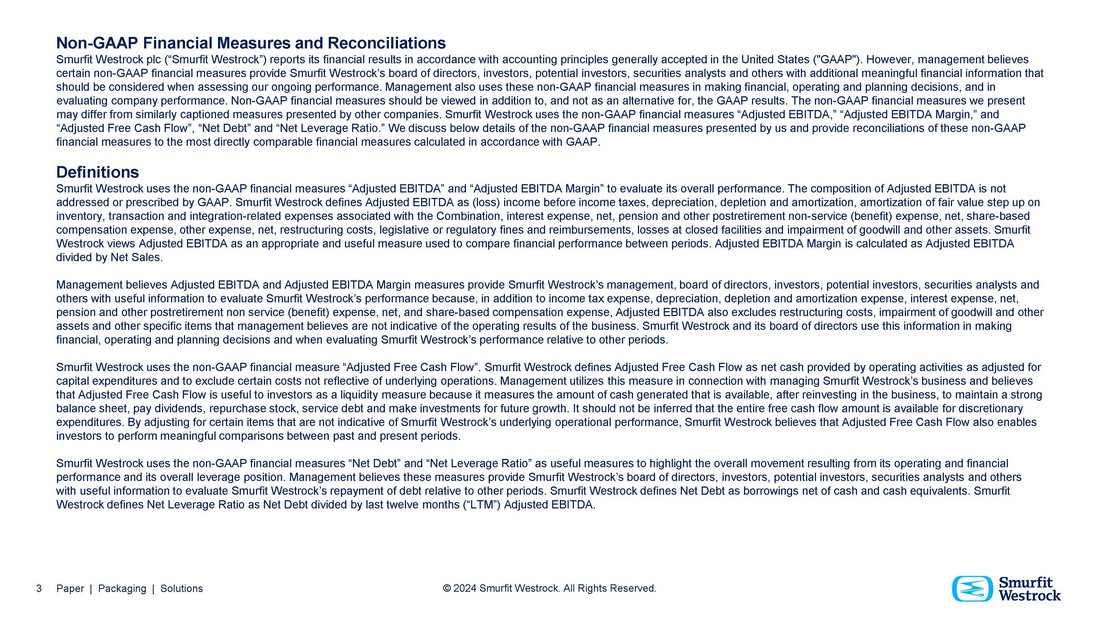 Non - GAAP Financial Measures and Reconciliations Smurfit Westrock plc (“Smurfit Westrock”) reports its financial results in accordance with accounting principles generally accepted in the United States ("GAAP"). However, management believes certain non - GAAP financial measures provide Smurfit Westrock’s board of directors, investors, potential investors, securities analysts and others with additional meaningful financial information that should be considered when assessing our ongoing performance. Management also uses these non - GAAP financial measures in making financial, operating and planning decisions, and in evaluating company performance. Non - GAAP financial measures should be viewed in addition to, and not as an alternative for, the GAAP results. The non - GAAP financial measures we present may differ from similarly captioned measures presented by other companies. Smurfit Westrock uses the non - GAAP financial measures “Adjusted EBITDA,” “Adjusted EBITDA Margin,” and “Adjusted Free Cash Flow”, “Net Debt” and “Net Leverage Ratio.” We discuss below details of the non - GAAP financial measures presented by us and provide reconciliations of these non - GAAP financial measures to the most directly comparable financial measures calculated in accordance with GAAP. Definitions Smurfit Westrock uses the non - GAAP financial measures “Adjusted EBITDA” and “Adjusted EBITDA Margin” to evaluate its overall performance. The composition of Adjusted EBITDA is not addressed or prescribed by GAAP. Smurfit Westrock defines Adjusted EBITDA as (loss) income before income taxes, depreciation, depletion and amortization, amortization of fair value step up on inventory, transaction and integration - related expenses associated with the Combination, interest expense, net, pension and other postretirement non - service (benefit) expense, net, share - based compensation expense, other expense, net, restructuring costs, legislative or regulatory fines and reimbursements, losses at closed facilities and impairment of goodwill and other assets. Smurfit Westrock views Adjusted EBITDA as an appropriate and useful measure used to compare financial performance between periods. Adjusted EBITDA Margin is calculated as Adjusted EBITDA divided by Net Sales. Management believes Adjusted EBITDA and Adjusted EBITDA Margin measures provide Smurfit Westrock’s management, board of directors, investors, potential investors, securities analysts and others with useful information to evaluate Smurfit Westrock’s performance because, in addition to income tax expense, depreciation, depletion and amortization expense, interest expense, net, pension and other postretirement non service (benefit) expense, net, and share - based compensation expense, Adjusted EBITDA also excludes restructuring costs, impairment of goodwill and other assets and other specific items that management believes are not indicative of the operating results of the business. Smurfit Westrock and its board of directors use this information in making financial, operating and planning decisions and when evaluating Smurfit Westrock’s performance relative to other periods. Smurfit Westrock uses the non - GAAP financial measure “Adjusted Free Cash Flow”. Smurfit Westrock defines Adjusted Free Cash Flow as net cash provided by operating activities as adjusted for capital expenditures and to exclude certain costs not reflective of underlying operations. Management utilizes this measure in connection with managing Smurfit Westrock’s business and believes that Adjusted Free Cash Flow is useful to investors as a liquidity measure because it measures the amount of cash generated that is available, after reinvesting in the business, to maintain a strong balance sheet, pay dividends, repurchase stock, service debt and make investments for future growth. It should not be inferred that the entire free cash flow amount is available for discretionary expenditures. By adjusting for certain items that are not indicative of Smurfit Westrock’s underlying operational performance, Smurfit Westrock believes that Adjusted Free Cash Flow also enables investors to perform meaningful comparisons between past and present periods. Smurfit Westrock uses the non - GAAP financial measures “Net Debt” and “Net Leverage Ratio” as useful measures to highlight the overall movement resulting from its operating and financial performance and its overall leverage position. Management believes these measures provide Smurfit Westrock’s board of directors, investors, potential investors, securities analysts and others with useful information to evaluate Smurfit Westrock’s repayment of debt relative to other periods. Smurfit Westrock defines Net Debt as borrowings net of cash and cash equivalents. Smurfit Westrock defines Net Leverage Ratio as Net Debt divided by last twelve months (“LTM”) Adjusted EBITDA. 3 Paper | Packaging | Solutions © 2024 Smurfit Westrock. All Rights Reserved.