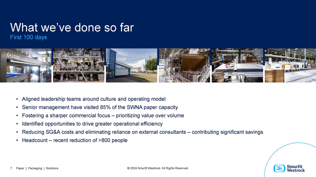Opportunities we’ve identified • Already excellent market positions • Experienced and motivated people at operational level • Opportunity for growth and cost - reducing capital allocation is significant • Opportunity to develop sharper commercial focus across the organization • Opportunity to promote and develop innovative approach for both a new and existing customer base • Opportunity to prioritize value over volume • Opportunity to increase operating efficiency, retaining and winning business through quality and service improvement Paper | Packaging | S olution s 6 6 Paper | Packaging | Solutions © 2024 Smurfit Westrock. All Rights Reserved.