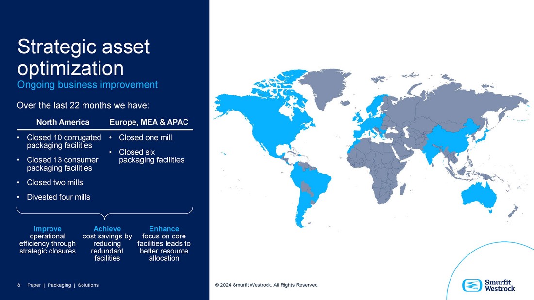 What we’ve done so far First 100 days • Aligned leadership teams around culture and operating model • Senior management have visited 85% of the SWNA paper capacity • Fostering a sharper commercial focus – prioritizing value over volume • Identified opportunities to drive greater operational efficiency • Reducing SG&A costs and eliminating reliance on external consultants – contributing significant savings • Headcount – recent reduction of >800 people 7 Paper | Packaging | Solutions © 2024 Smurfit Westrock. All Rights Reserved.