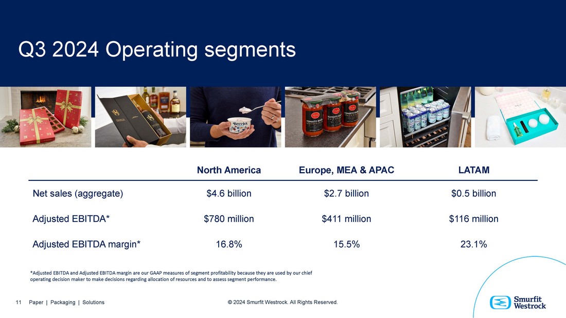 $7.671bn 10 Paper | Packaging | Solutions © 2024 Smurfit Westrock. All Rights Reserved. Net Sales $1.265bn Adj. EBITDA* 16.5% Adj. EBITDA Margin* $118m Adjusted Free Cash Flow* Q3 2024 Smurfit Westrock results *Adjusted EBITDA, Adjusted EBITDA Margin, and Adjusted Free Cash Flow are non - GAAP financial measures. See the Appendix for the discussion and reconciliation of these measures to the most comparable GAAP measures.