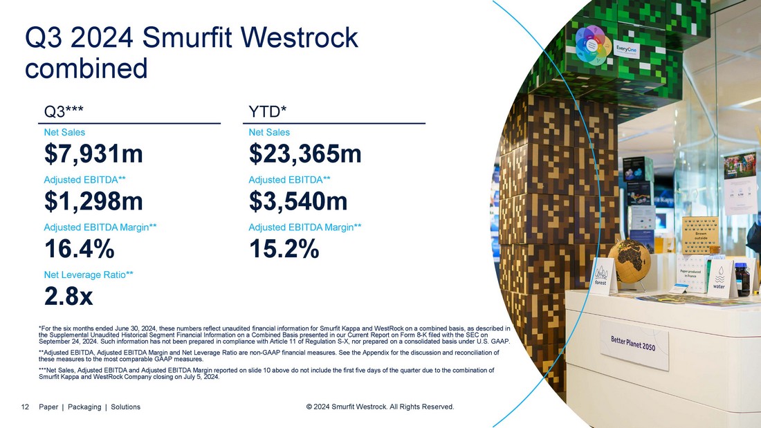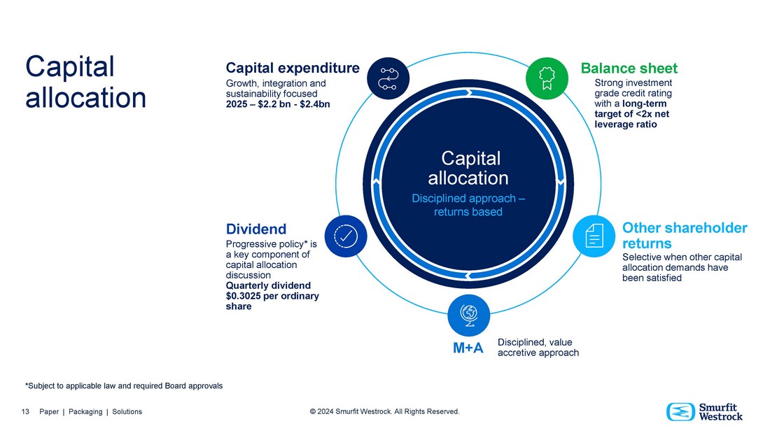 Option A NEED TO ADJUST FOR THE FIRST TRADING WEEK Q3 2024 Smurfit Westrock combined Q3*** Net Sales $7,931m Adjusted EBITDA** $1,298m Adjusted EBITDA Margin** 16.4% Net Leverage Ratio** 2.8x 12 Paper | Packaging | Solutions © 2024 Smurfit Westrock. All Rights Reserved. YTD* Net Sales $23,365m Adjusted EBITDA** $3,540m Adjusted EBITDA Margin** 15.2% *For the six months ended June 30, 2024, these numbers reflect unaudited financial information for Smurfit Kappa and WestRock on a combined basis, as described in the Supplemental Unaudited Historical Segment Financial Information on a Combined Basis presented in our Current Report on Form 8 - K filed with the SEC on September 24, 2024. Such information has not been prepared in compliance with Article 11 of Regulation S - X, nor prepared on a consolidated basis under U.S. GAAP. **Adjusted EBITDA, Adjusted EBITDA Margin and Net Leverage Ratio are non - GAAP financial measures. See the Appendix for the discussion and reconciliation of these measures to the most comparable GAAP measures. ***Net Sales, Adjusted EBITDA and Adjusted EBITDA Margin reported on slide 10 above do not include the first five days of the quarter due to the combination of Smurfit Kappa and WestRock Company closing on July 5, 2024.