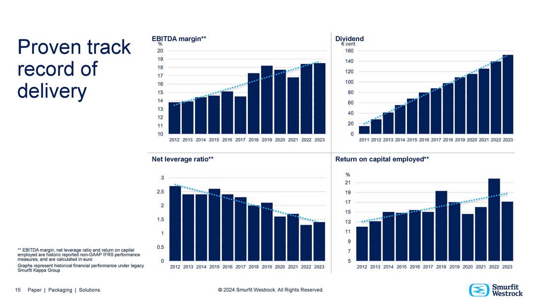 EBITDA margin** Net leverage ratio** Return on capital employed** 19 18 17 16 15 14 13 12 11 10 15 Paper | Packaging | Solutions © 2024 Smurfit Westrock. All Rights Reserved. 2012 2013 2014 2015 2016 2017 2018 2019 2020 2021 2022 2023 2012 2013 2014 2015 2016 2017 2018 2019 2020 2021 2022 2023 0 0.5 1 1.5 2 2.5 3 2012 2013 2014 2015 2016 2017 2018 2019 2020 2021 2022 2023 140 120 100 80 60 40 20 0 2011 2012 2013 2014 2015 2016 2017 2018 2019 2020 2021 2022 2023 % 21 19 17 15 13 11 9 7 5 % 20 Dividend € cent 160 ** EBITDA margin, net leverage ratio and return on capital employed are historic reported non - GAAP IFRS performance measures, and are calculated in euro Graphs represent historical financial performance under legacy Smurfit Kappa Group Proven track record of delivery