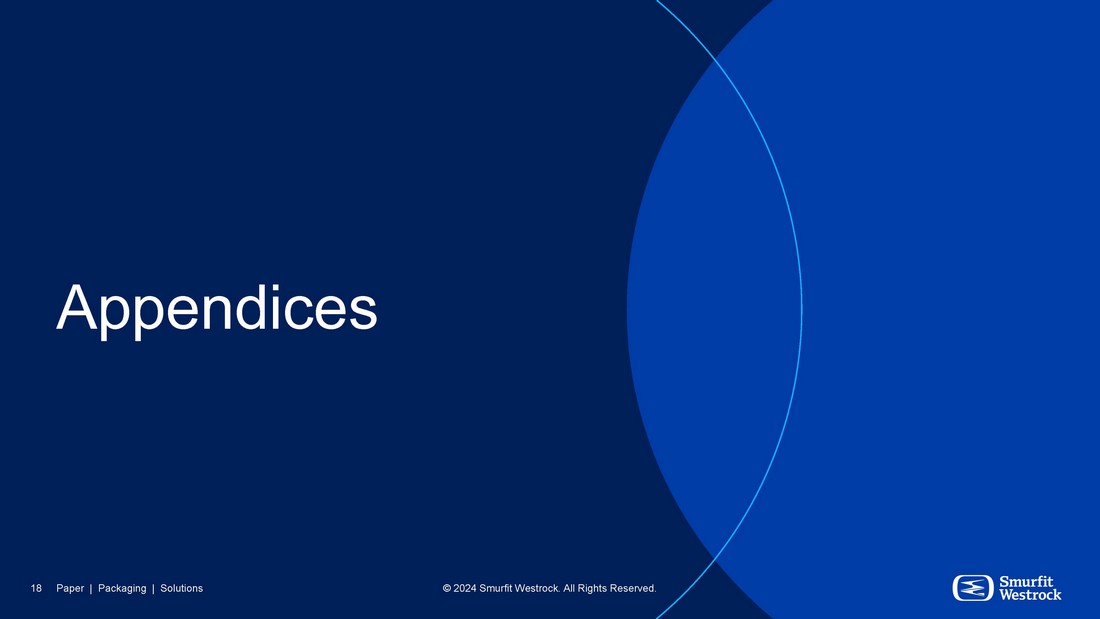 Delivering to combined potential The opportunity is bigger and better than what we initially anticipated • Affirming stated $400 million synergy target • Significantly more value to be created through operational and commercial improvement (at least equal to the stated synergy target of $400 million) • Empowering and incentivising owner operators driving higher returns • Sharper commercial focus • Already seeing initial results from actions taken • Capital plans - 2025 Capex of $2.2 - $2.4 billion – versus initial estimate of >$2.8 billion • 2024 Full Year Combined Adj. EBITDA* approx. $4.7 billion Our third quarter performance, combined with our deeper knowledge of the combination and continuing asset optimization, clearly points to the opportunities ahead for Smurfit Westrock. - Tony Smurfit “ “ Owner - operator management team with a proven track record of delivery * 2024 Full Year Combined Adjusted EBITDA is a non - GAAP financial measure. We have not reconciled Adjusted EBITDA outlook to the most comparable GAAP outlook because it is not possible to do so without unreasonable efforts due to the uncertainty and potential variability of reconciling items, which are dependent on future events and often outside of management’s control and which could be significant. Because such items cannot be reasonably predicted with the level of precision required, we are unable to provide an outlook for the comparable GAAP measure (net income). For the six months ended June 30, 2024, this number reflects results of Smurfit Kappa and WestRock on a combined basis, as described in the Supplemental Unaudited Historical Segment Financial Information on a Combined Basis presented in our Current Report on Form 8 - K filed with the SEC on September 24, 2024. Such information has not been prepared in compliance with Article 11 of Regulation S - X, nor prepared on a consolidated basis under U.S. GAAP. 17 Paper | Packaging | Solutions © 2024 Smurfit Westrock. All Rights Reserved.