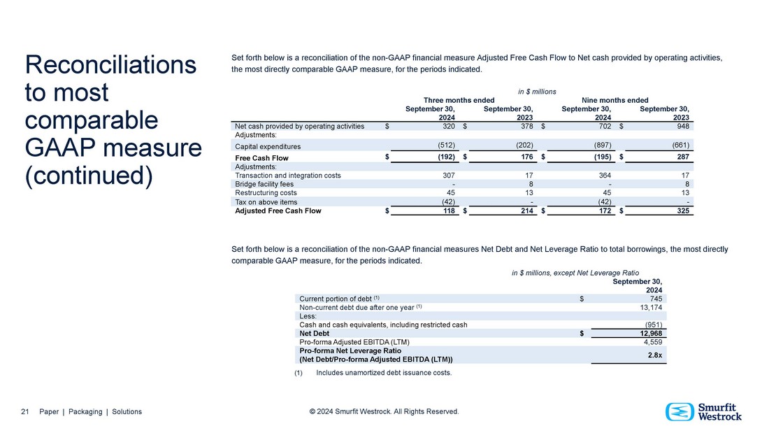 Reconciliations to most comparable GAAP measure 20 Paper | Packaging | Solutions © 2024 Smurfit Westrock. All Rights Reserved. Set forth below is a reconciliation of the non - GAAP financial measures Adjusted EBI TDA and Adjusted EBITDA Margin to Net income and Net Income Margin, the most directly comparable GAAP measures, for the periods indicated. (1) Other adjustments for the three months ended September 30, 2024 include restructuring costs of $19 million, losses at closed facilities of $8 million and impairment of other assets of $2 million (three months ended September 30, 2023: $ - million, $ - million & $ - million, respectively). Other adjustments for the nine months ended September 30, 2024 include restructuring costs of $19 million, losses at closed facilities of $8 million and impairment of other assets of $2 million partially offset by legislative or regulatory fine reimbursement of $18 million (nine months ended September 30, 2023: $ - million, $ - million, $ million & $ - million, respectively). in $ millions, except margin percentages Nine months ended Three months ended September 30, 2024 September 30, 2023 September 30, 2024 173 $ 229 $ (150) $ Net (loss) income 164 73 33 Income tax expense 872 147 564 Depreciation, depletion and amortization 227 - 227 Amortization of fair value step up on inventory 350 17 267 Transaction and integration - related expenses associated with the Combination 225 39 167 Interest expense, net 31 9 (8) Pension and other postretirement non - service (benefit) expense, net 154 7 123 Share - based compensation expense 13 4 13 Other expense, net 11 - 29 Other adjustments (1) 2,220 $ 525 $ 1,265 $ Adjusted EBITDA 1.3% 7.8% (2.0%) Net Income Margin (Net Income/Net Sales) 16.4% 18.0% 16.5% Adjusted EBITDA Margin (Adjusted EBITDA/Net Sales)