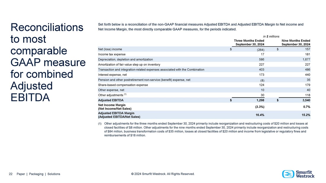 Reconciliations to most comparable GAAP measure (continued) 21 Paper | Packaging | Solutions © 2024 Smurfit Westrock. All Rights Reserved. Set forth below is a reconciliation of the non - GAAP financial measure Adjusted Free Cash Flow to Net cash provided by operating activities, the most directly comparable GAAP measure, for the periods indicated. Set forth below is a reconciliation of the non - GAAP financial measures Net Debt and Net Leverage Ratio to total borrowings, the most directly comparable GAAP measure, for the periods indicated. (1) Includes unamortized debt issuance costs. in $ millions, except Net Leverage Ratio September 30, 2024 745 $ Current portion of debt (1) 13,174 Non - current debt due after one year (1) Less: (951) Cash and cash equivalents, including restricted cash 12,968 $ Net Debt 4,559 Pro - forma Adjusted EBITDA (LTM) 2.8x Pro - forma Net Leverage Ratio (Net Debt/Pro - forma Adjusted EBITDA (LTM)) in $ millions Nine months ended Three months ended September 30, 2023 September 30, 2024 September 30, 2023 September 30, 2024 948 $ 702 $ 378 $ 320 $ Net cash provided by operating activities Adjustments: (661) (897) (202) (512) Capital expenditures 287 $ (195) $ 176 $ (192) $ Free Cash Flow Adjustments: 17 364 17 307 Transaction and integration costs - 8 - Bridge facility fees 13 45 13 45 Restructuring costs - (42) - (42) Tax on above items 325 $ 172 $ 214 $ 118 $ Adjusted Free Cash Flow