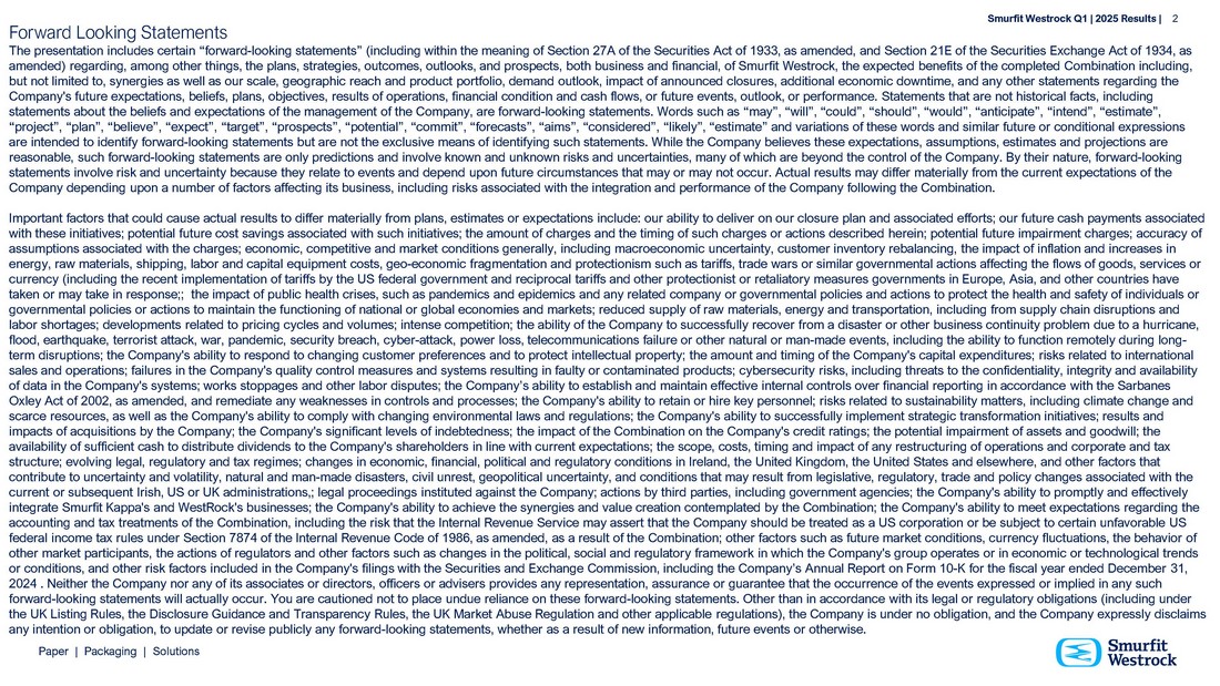 Smurfit Westrock Q1 | 2025 Results | 2 Paper | Packaging | Solutions Forward Looking Statements The presentation includes certain “forward - looking statements” (including within the meaning of Section 27A of the Securities Act of 1933, as amended, and Section 21E of the Securities Exchange Act of 1934, as amended) regarding, among other things, the plans, strategies, outcomes, outlooks, and prospects, both business and financial, of Smurfit Westrock, the expected benefits of the completed Combination including, but not limited to, synergies as well as our scale, geographic reach and product portfolio, demand outlook, impact of announced closures, additional economic downtime, and any other statements regarding the Company's future expectations, beliefs, plans, objectives, results of operations, financial condition and cash flows, or future events, outlook, or performance. Statements that are not historical facts, including statements about the beliefs and expectations of the management of the Company, are forward - looking statements. Words such as “may”, “will”, “could”, “should”, “would”, “anticipate”, “intend”, “estimate”, “project”, “plan”, “believe”, “expect”, “target”, “prospects”, “potential”, “commit”, “forecasts”, “aims”, “considered”, “likely”, “estimate” and variations of these words and similar future or conditional expressions are intended to identify forward - looking statements but are not the exclusive means of identifying such statements. While the Company believes these expectations, assumptions, estimates and projections are reasonable, such forward - looking statements are only predictions and involve known and unknown risks and uncertainties, many of which are beyond the control of the Company. By their nature, forward - looking statements involve risk and uncertainty because they relate to events and depend upon future circumstances that may or may not occur. Actual results may differ materially from the current expectations of the Company depending upon a number of factors affecting its business, including risks associated with the integration and performance of the Company following the Combination. Important factors that could cause actual results to differ materially from plans, estimates or expectations include: our ability to deliver on our closure plan and associated efforts; our future cash payments associated with these initiatives; potential future cost savings associated with such initiatives; the amount of charges and the timing of such charges or actions described herein; potential future impairment charges; accuracy of assumptions associated with the charges; economic, competitive and market conditions generally, including macroeconomic uncertainty, customer inventory rebalancing, the impact of inflation and increases in energy, raw materials, shipping, labor and capital equipment costs, geo - economic fragmentation and protectionism such as tariffs, trade wars or similar governmental actions affecting the flows of goods, services or currency (including the recent implementation of tariffs by the US federal government and reciprocal tariffs and other protectionist or retaliatory measures governments in Europe, Asia, and other countries have taken or may take in response;; the impact of public health crises, such as pandemics and epidemics and any related company or governmental policies and actions to protect the health and safety of individuals or governmental policies or actions to maintain the functioning of national or global economies and markets; reduced supply of raw materials, energy and transportation, including from supply chain disruptions and labor shortages; developments related to pricing cycles and volumes; intense competition; the ability of the Company to successfully recover from a disaster or other business continuity problem due to a hurricane, flood, earthquake, terrorist attack, war, pandemic, security breach, cyber - attack, power loss, telecommunications failure or other natural or man - made events, including the ability to function remotely during long - term disruptions; the Company's ability to respond to changing customer preferences and to protect intellectual property; the amount and timing of the Company's capital expenditures; risks related to international sales and operations; failures in the Company's quality control measures and systems resulting in faulty or contaminated products; cybersecurity risks, including threats to the confidentiality, integrity and availability of data in the Company's systems; works stoppages and other labor disputes; the Company’s ability to establish and maintain effective internal controls over financial reporting in accordance with the Sarbanes Oxley Act of 2002, as amended, and remediate any weaknesses in controls and processes; the Company's ability to retain or hire key personnel; risks related to sustainability matters, including climate change and scarce resources, as well as the Company's ability to comply with changing environmental laws and regulations; the Company's ability to successfully implement strategic transformation initiatives; results and impacts of acquisitions by the Company; the Company's significant levels of indebtedness; the impact of the Combination on the Company's credit ratings; the potential impairment of assets and goodwill; the availability of sufficient cash to distribute dividends to the Company's shareholders in line with current expectations; the scope, costs, timing and impact of any restructuring of operations and corporate and tax structure; evolving legal, regulatory and tax regimes; changes in economic, financial, political and regulatory conditions in Ireland, the United Kingdom, the United States and elsewhere, and other factors that contribute to uncertainty and volatility, natural and man - made disasters, civil unrest, geopolitical uncertainty, and co