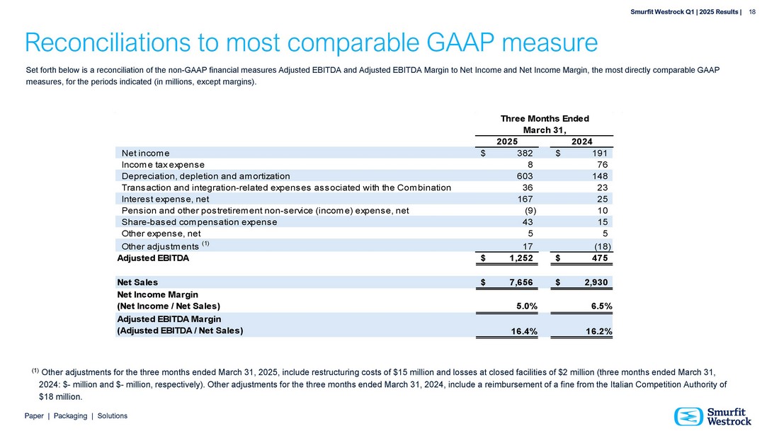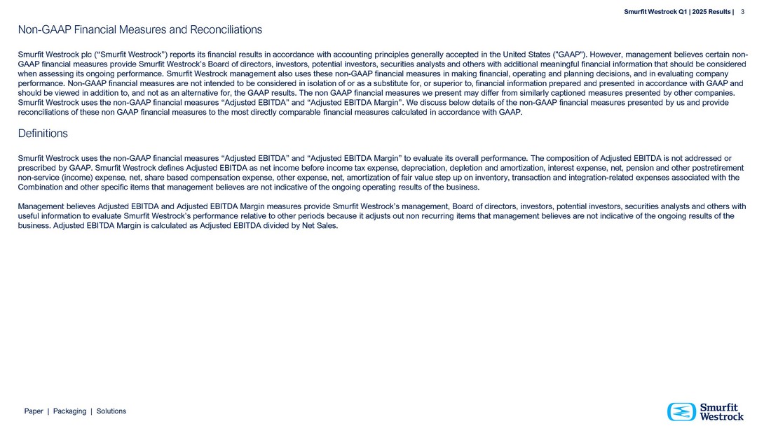 Smurfit Westrock Q1 | 2025 Results | 3 Paper | Packaging | Solutions Non - GAAP Financial Measures and Reconciliations Smurfit Westrock plc (“Smurfit Westrock”) reports its financial results in accordance with accounting principles generally accepted in the United States ("GAAP"). However, management believes certain non - GAAP financial measures provide Smurfit Westrock’s Board of directors, investors, potential investors, securities analysts and others with additional meaningful financial information that should be considered when assessing its ongoing performance. Smurfit Westrock management also uses these non - GAAP financial measures in making financial, operating and planning decisions, and in evaluating company performance. Non - GAAP financial measures are not intended to be considered in isolation of or as a substitute for, or superior to, financial information prepared and presented in accordance with GAAP and should be viewed in addition to, and not as an alternative for, the GAAP results. The non GAAP financial measures we present may differ from similarly captioned measures presented by other companies. Smurfit Westrock uses the non - GAAP financial measures “Adjusted EBITDA” and “Adjusted EBITDA Margin”. We discuss below details of the non - GAAP financial measures presented by us and provide reconciliations of these non GAAP financial measures to the most directly comparable financial measures calculated in accordance with GAAP. Definitions Smurfit Westrock uses the non - GAAP financial measures “Adjusted EBITDA” and “Adjusted EBITDA Margin” to evaluate its overall performance. The composition of Adjusted EBITDA is not addressed or prescribed by GAAP. Smurfit Westrock defines Adjusted EBITDA as net income before income tax expense, depreciation, depletion and amortization, interest expense, net, pension and other postretirement non - service (income) expense, net, share based compensation expense, other expense, net, amortization of fair value step up on inventory, transaction and integration - related expenses associated with the Combination and other specific items that management believes are not indicative of the ongoing operating results of the business. Management believes Adjusted EBITDA and Adjusted EBITDA Margin measures provide Smurfit Westrock’s management, Board of directors, investors, potential investors, securities analysts and others with useful information to evaluate Smurfit Westrock’s performance relative to other periods because it adjusts out non recurring items that management believes are not indicative of the ongoing results of the business. Adjusted EBITDA Margin is calculated as Adjusted EBITDA divided by Net Sales.