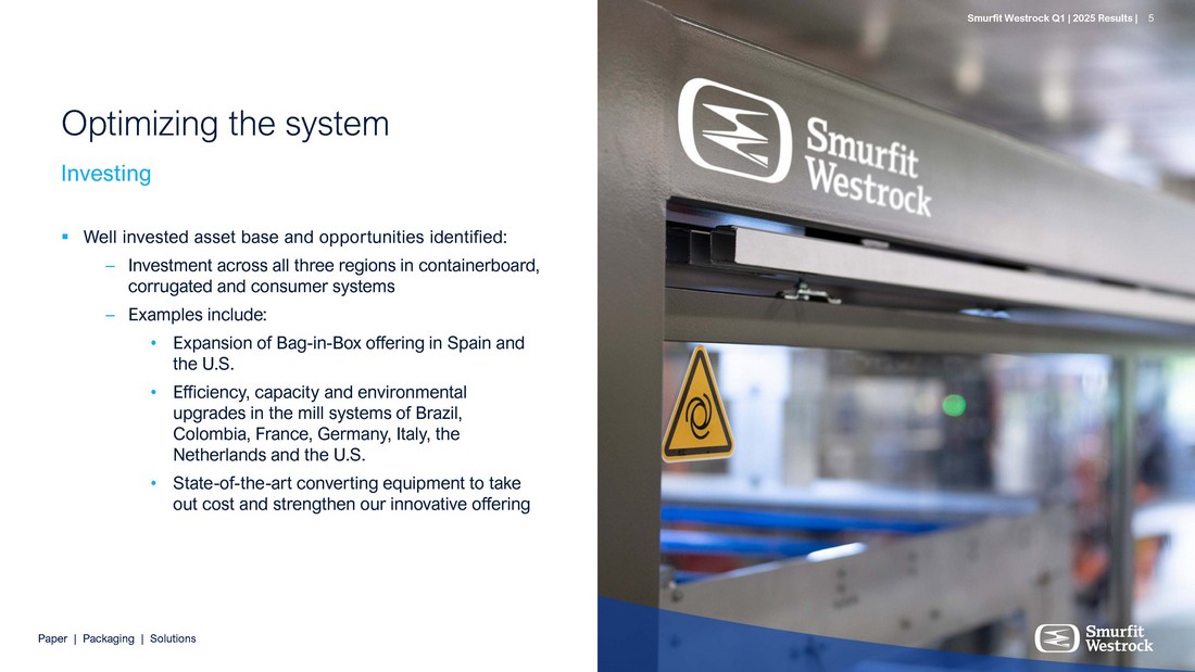 Smurfit Westrock Q1 | 2025 Results | 4 Adjusted EBITDA* of $1,252 million Adjusted EBITDA margin* of 16.4% ▪ Strong first quarter performance across all three regions ▪ Synergy program on track ▪ Ongoing system optimization through investment and rationalization ▪ Proven team with an established track record of superior performance Key messages Smurfit Westrock Q1 | 2025 Results | 4 Paper | Packaging | Solutions *Adjusted EBITDA and Adjusted EBITDA Margin are non - GAAP financial measures. See the Appendix for the reconciliation of these measures to the most comparable GAAP measures.