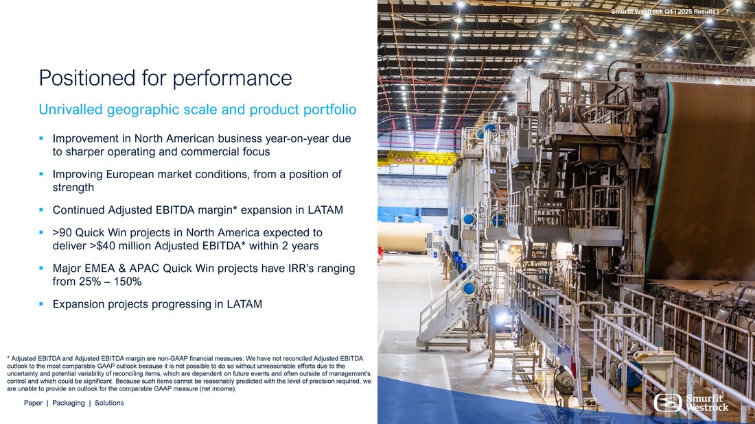 Smurfit Westrock Q1 | 2025 Results | 7 Unrivalled geographic scale and product portfolio ▪ Improvement in North American business year - on - year due to sharper operating and commercial focus ▪ Improving European market conditions, from a position of strength ▪ Continued Adjusted EBITDA margin* expansion in LATAM ▪ >90 Quick Win projects in North America expected to deliver >$40 million Adjusted EBITDA* within 2 years ▪ Major EMEA & APAC Quick Win projects have IRR’s ranging from 25% – 150% ▪ Expansion projects progressing in LATAM Paper | Packaging | Solutions Positioned for performance Smurfit Westrock Q1 | 2025 Results | 7 * Adjusted EBITDA and Adjusted EBITDA margin are non - GAAP financial measures. We have not reconciled Adjusted EBITDA outlook to the most comparable GAAP outlook because it is not possible to do so without unreasonable efforts due to the uncertainty and potential variability of reconciling items, which are dependent on future events and often outside of management's control and which could be significant. Because such items cannot be reasonably predicted with the level of precision required, we are unable to provide an outlook for the comparable GAAP measure (net income).