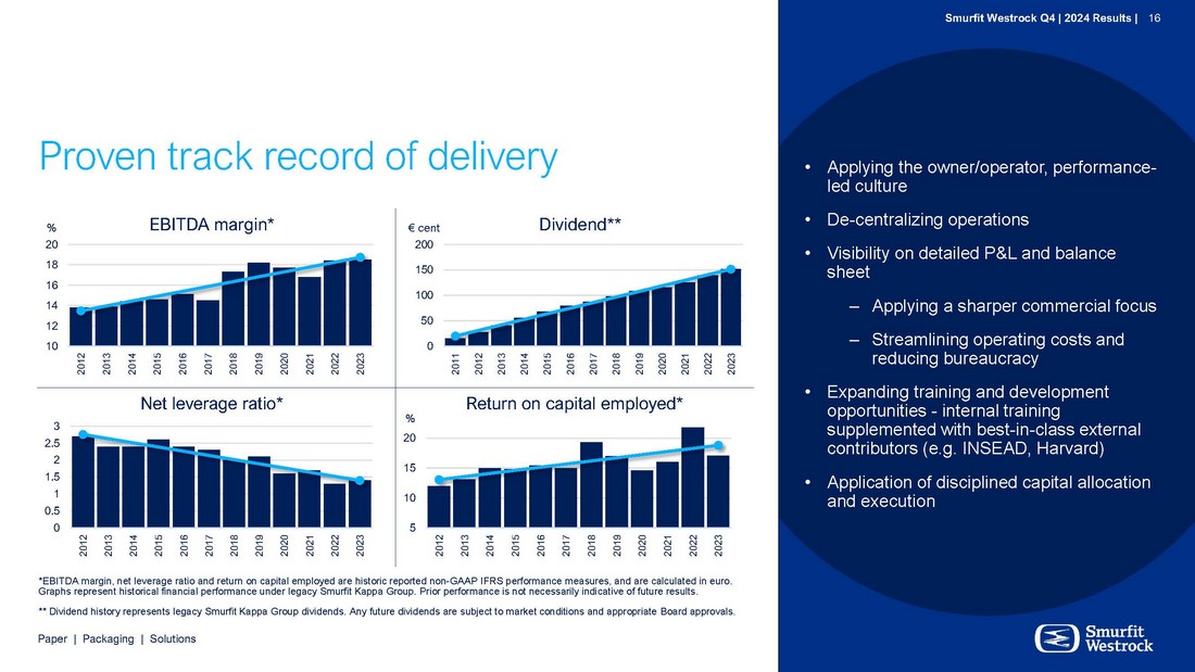 EBITDA margin* Dividend** Net leverage ratio* Return on capital employed* 2012 2013 2014 2015 2016 2017 2018 2019 2020 2021 2022 2023 5 10 15 2012 2013 2014 2015 2016 2017 2018 2019 2020 2021 2022 2023 3 2.5 2 1.5 1 0.5 0 2012 2013 2014 2015 2016 2017 2018 2019 2020 2021 2022 2023 50 0 150 100 2011 2012 2013 2014 2015 2016 2017 2018 2019 2020 2021 2022 2023 % 20 18 16 14 12 10 % 20 € cent 200 *EBITDA margin, net leverage ratio and return on capital employed are historic reported non - GAAP IFRS performance measures, and are calculated in euro. Graphs represent historical financial performance under legacy Smurfit Kappa Group. Prior performance is not necessarily indicative of future results. ** Dividend history represents legacy Smurfit Kappa Group dividends. Any future dividends are subject to market conditions and appropriate Board approvals. Proven track record of delivery • Applying the owner/operator, performance - led culture • De - centralizing operations • Visibility on detailed P&L and balance sheet – Applying a sharper commercial focus – Streamlining operating costs and reducing bureaucracy • Expanding training and development opportunities - internal training supplemented with best - in - class external contributors (e.g. INSEAD, Harvard) • Application of disciplined capital allocation and execution Smurfit Westrock Q4 | 2024 Results | 16 Paper | Packaging | Solutions