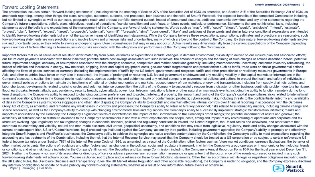 P a per | P a c k a g i n g | So l u t i ons F o r w a r d L ooking S t a t e m e n ts S m u r f i t We s t r o c k Q 3 | 202 5 R e s ul t s | 2 Th e p r e s e n t a t i o n i n c l u d e s ce rt a i n “ forw a r d - l o o k i ng s t a t e m e n t s ” ( i n c l u d i ng w i t h i n t h e m e a n i ng of S ec t i o n 2 7A of th e S e c ur i t i e s A c t of 1 9 3 3 , a s a m e n d ed , a n d S ec t i o n 2 1 E of t h e S ec ur i t i e s E x c h a ng e A c t of 1 9 3 4 , a s a m e n d ed ) r e g a r d i ng, a m o n g ot h e r t h i ng s , t h e p l a n s , s tr a t e g i e s , o u t c o m e s , ou t l o o ks , a n d p ro s pec t s , b o t h b u s i n e ss a n d f i n a n c i a l , of S m urfit W e s tr o c k , t h e e x pec t e d be n e f i t s of t h e c o m p l e t e d C o m b i n a t i o n i n c l u d i ng, b u t n o t limi t e d t o , sy n e rg i e s a s w e ll a s o u r s c a l e , g e ogr ap h i c r ea c h a n d p ro d u c t p or t fol i o, de m a n d o u t l o o k , im p a c t of a n n o u n c ed c l o s ur e s , a dd i t i o n a l ec o n o m i c d own t im e , a n d a n y o t h e r s t a t e m e n t s r e g a r d i ng t h e C o m p a n y ' s fut u r e e x pec t a t i o n s , be li e f s , p l a n s , o b j ec t i ve s, r e s u l t s of o p e r a t i o n s , f i n a n c i a l c o n d i t i o n a n d c a s h f l ow s , or fu t u r e e ve n t s , ou t l o o k , or p e rfor m a n c e . S t a t e m e n t s t h a t a r e n o t h i s t o r i c a l f a c t s , i n c l u d i ng s t a t e m e n t s a b o u t t h e be li e f s a n d e x pec t a t i o n s of t h e m a n a g e m e n t of t h e C o m p a n y , a r e forw a r d - l o o k i ng s t a t e m e n t s . W o r d s s u c h a s “ m a y ” , “ w i ll” , “ c o u l d ” , “ s h o u l d ” , “ woul d ” , “ a n t i c i p a t e ” , “i n t e n d ” , “ e s t i m a t e ” , “ p ro j ec t” , “ p l a n ”, “ be li e ve” , “ e x pec t” , “ t a rg e t” , “ p ro s pec t s ” , “ p o t e n t i a l” , “ c o m mi t” , “ for e c a s t s ” , “ a im s ” , “ c o n s i de r e d ” , “li k e l y ” a n d var i a t i o n s of th e s e wor d s a n d s imil a r fut u r e or c o n d i t i o n a l e x p r e ss i o n s a r e i n t e n d ed t o i de n t i f y forw a r d - l o o k i ng s t a t e m e n t s b u t a r e n o t t h e e x c l u s i ve m e a n s of i de n t i f yi ng s u c h s t a t e m e n t s . W h il e th e C o m p a n y be li e v e s t h e s e e x pec t a t i o n s , a ss u m p t i o n s , e s t i m a t e s a n d p ro j ec t i o n s a r e r ea s o n a b l e , s u c h f o rw a r d - l oo k i n g s t a t e m e n ts a r e on l y p r e d i c tio n s a n d i n vo l v e k no wn a n d un k no wn r i sks a n d un ce rt a i n ti e s , m a n y o f w h i c h a r e be y on d t h e c on tr o l o f t h e C o m p a n y . B y t h e i r n a t u r e , f o rw a r d - l oo k i n g s t a t e m e n ts i n vo l v e r i sk a n d un ce rt a i n ty bec a u s e t h e y r e l a t e t o e v e n ts a n d depe n d u p on f u t u r e c i r c u m s t a n ce s t ha t m a y or m a y n o t o cc u r. A c t ua l r e s u l t s m a y d i f f e r m a t e r i a ll y fr o m t h e c u rr e n t e x p ec t a tio n s o f t h e C o m p a n y depe n d i n g u p o n a n u m be r of f ac t o r s a ff e c t i ng i t s b u s i n e ss , i n c l u d i ng r i sks a ss o c i a t e d w i t h th e i n t e gr a t i o n a n d pe rfor m a n c e of t h e C o m p a n y fol l ow i ng t h e C o m b i n a t i o n . I m p or t a n t f ac t o r s t h a t c o u l d c a u s e a c t u a l r e s u l t s t o d i ff e r m a t e r i a ll y fro m p l a n s , e s t i m a t e s or e x pec t a t i o n s i n c l u d e : c h a ng e s i n de m a n d e nv i ro n m e n t , our a b ili t y to d e li ver o n o u r c l o s ur e p l a n a n d a ss o c i a t e d e ff o rt s ; o u r fut u r e c a s h p a y m e n t s a ss o c i a t e d w i t h th e s e i n i t i a t i ve s; p o t e n t i a l fu t ur e c o s t s a v i ng s a ss o c i a t e d w i t h s u c h i n i t i a t i ve s; t h e a m o u n t of c h a rg e s a n d t h e t i mi ng of s u c h c h a rg e s or a c t i o n s d e s c r i bed h e r e i n; p o t e n t i a l fu t ur e i m p a i r m e n t c h a rg e s ; a cc ur ac y of a ss u m p t i o n s a ss o c i a t e d w i t h t h e c h a rg e s ; ec o n o m i c , c o m pe t i t i ve a n d m a r k e t c o n d i t i o n s g e n e r a ll y , i n c l u d i ng m a c ro e c o n o m i c u n ce rt a i n t y , c u s t o m e r i nv e n t or y r e b a l a n c i ng, t h e im p a c t of i nfla t i o n a n d i n c r ea s e s i n e n e rg y , r a w m a t e r i a l s , s h i pp i ng, l a b or a n d c a p i t a l eq u i p m e n t c o s t s , g e o - ec o n o m i c fr a g m e n t a t i o n a n d p ro t ec t i o n i s m s u c h a s t a r i ff s , tr a de w a r s or s imil a r gov e rn m e n t a l a c t i o n s a ff e c t i ng t h e f l ow s of go o d s , s e r v i ce s or c urr e n c y ( i n c l u d i ng t h e im p l e m e n t a t i o n of t a r i ff s b y t h e US f ede r a l gov e rn m e n t a n d r e c i p ro c a l t a r i ff s a n d o t h e r p ro t ec t i o n i s t or r e t a li a t o r y m e a s ur e s gov e rn m e n t s i n E ur o pe , A s i a , a n d o t h e r c oun tri e s h a v e t a k e n or m a y t a k e i n r e s p on s e ) ; t h e i m p a c t o f p r o l on g e d o r r ec u rr i n g U. S . f e de r a l g o v e r n m e n t s hu t d o w n s a n d a n y r e s u l ting vol a ti l i ty i n t h e ca p i t a l m a r k e ts o r i n t e rr u p tio n s i n t h e C o m p a n y ’ s a c ce ss t o c a p i t a l ; t h e i m p a c t of p u b li c h e a l t h c r i s e s , s u c h a s p a n d e mi c s a n d ep i de mi c s a n d a n y r e l a t e d c o m p a n y or gov e rn m e n t a l p o l i c i e s a n d a c t i on s t o p ro t ec t t h e h e a l t h a n d s a f e t y of i n d i v i d u a l s or gov e rn m e n t a l p o l i c i e s or a c t i o n s to m a i n t a i n t h e fun c t i o n i
