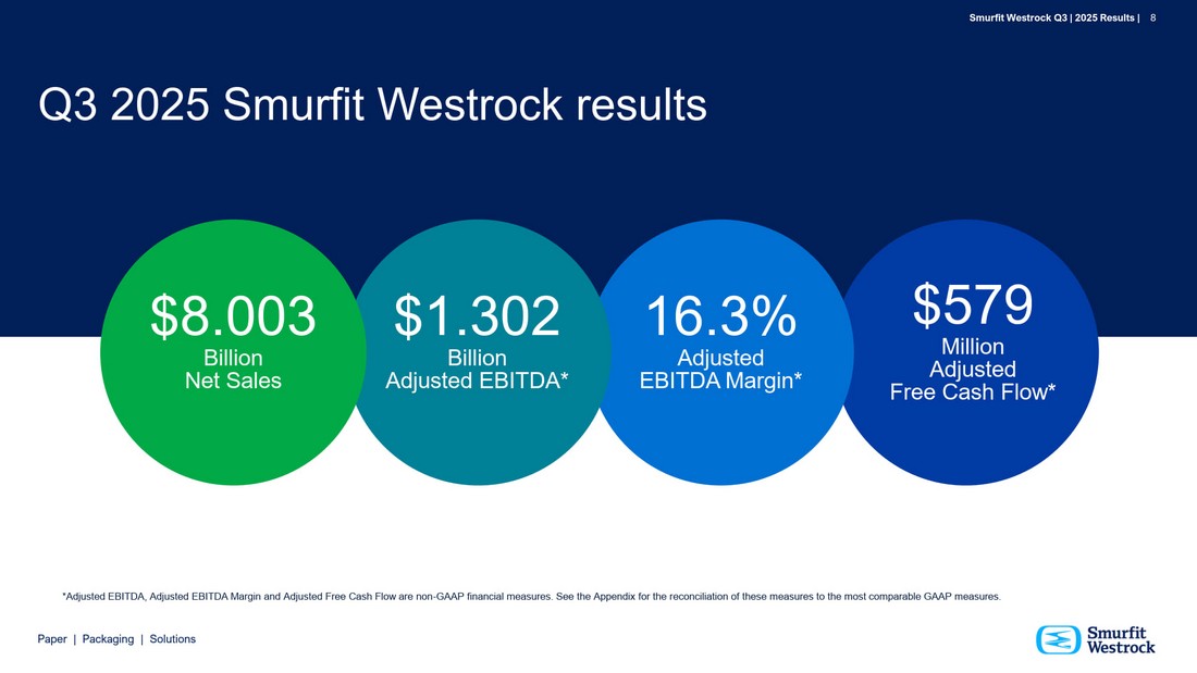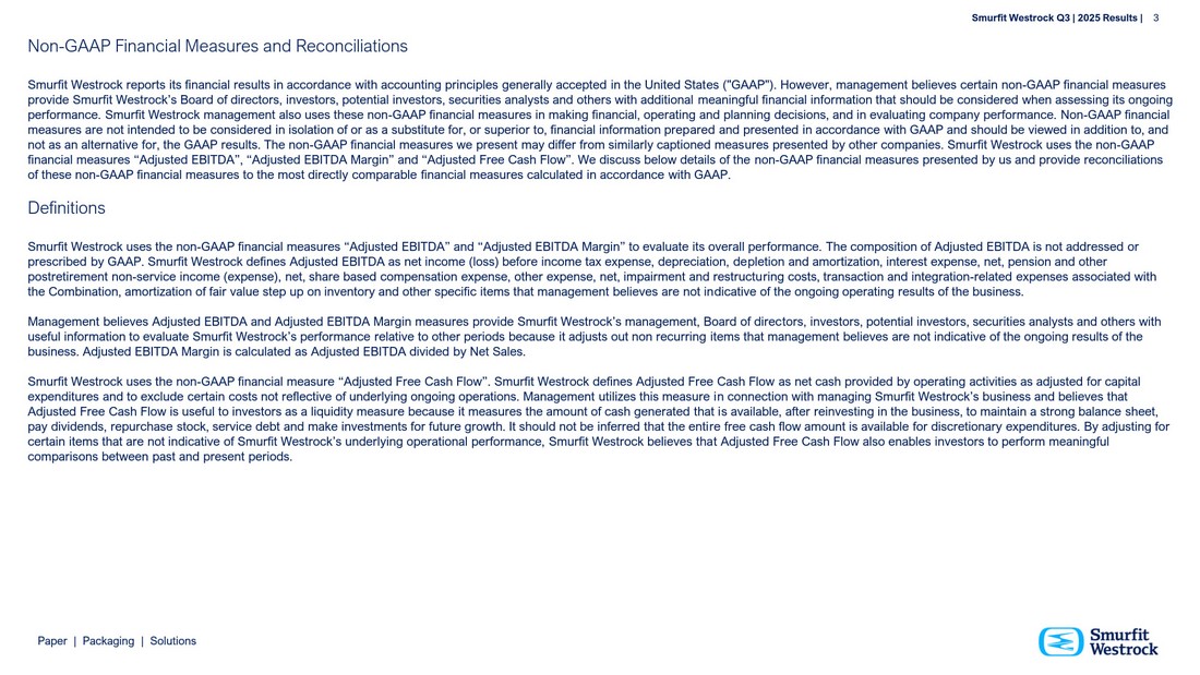 P a per | P a c k a g i n g | So l u t i ons S m u r f i t We s t r o c k Q 3 | 202 5 R e s ul t s | 3 No n - GA A P F ina n cial M e a s u r e s a n d R e c o n c i l i a tio ns S m u rfit W e s tr o c k r e p o rts i ts fin a n c i a l r e s u l ts i n a cc o r d a n c e w i t h a cc oun ting p r i n c i p l e s g e n e r a ll y a ccep te d i n t h e U n i t e d S t a t e s ( " G AA P " ) . H o w e v e r, m a n a g e m e n t be li e v e s ce rt a i n no n - G AA P fin a n c i a l m e a s u r e s p rov i de S m urfit W e s tr o c k ’ s B o a r d of d i r e c t o r s , i nv e s t o r s , p o t e n t i a l i nv e s t o r s , s ec ur i t i e s a n a l ys t s a n d o t h e r s w i t h a d d i t i o n a l m e a n i ngf u l f i n a n c i a l i nf o r m a t i o n t h a t s h o u l d be c o n s i de r e d wh e n a ss e ss i ng i t s ongoing pe rfor m a n c e . S m urfit W e s tr o c k m a n a g e m e n t a l s o u s e s th e s e n o n - G AA P f i n a n c i a l m e a s ur e s i n m a k i ng f i n a n c i a l , o p e r a t i ng a n d p l a n n i n g dec i s i o n s , a n d i n e valu a t i ng c o m p a n y pe rfor m a n c e . N o n - G AA P f i n a n c i a l m e a s ur e s a r e n o t i n t e n d ed t o b e c o n s i de r e d i n i s o l a t i o n of or a s a s u b s t i t u t e for, or s u p e r i or t o , f i n a n c i a l i nf o r m a t i o n p r e p a r e d a n d p r e s e n t ed i n a cc or d a n c e w i t h G AA P a n d s h o u l d be v i e w e d i n a dd i t i o n t o , a n d n o t a s a n alt e rn a t i ve for, th e G AA P r e s u l t s . Th e n o n - G AA P f i n a n c i a l m e a s ur e s w e p r e s e n t m a y d i ff e r fro m s imil a r l y c a p t i o n ed m e a s ur e s p r e s e n t ed b y ot h e r c o m p a n i e s . S m urfit W e s tr o c k u s e s t h e n o n - G AA P f i n a n c i a l m e a s ur e s “ A d j u s t e d E B IT D A ” , “ A d j u s t e d E B IT D A M a rg i n ” a n d “ A d j u s t e d Fr e e Ca s h Flow ” . W e d i s c u s s b e l ow de t a il s of t h e non - G AA P f i n a n c i a l m e a s ur e s p r e s e n t ed b y u s a n d p rov i de r e c o n c ili a t i o n s of t h e s e n o n - G AA P f i n a n c i a l m e a s ur e s t o th e m o s t d i r e c t l y c o m p a r a b l e f i n a n c i a l m e a s ur e s c a l c u l a t e d i n a cc or d a n c e w i t h G AA P. D e f i nit i ons S m urfit W e s tr o c k u s e s th e n o n - G AA P f i n a n c i a l m e a s ur e s “ A d j u s t e d E B IT D A ” a n d “ A d j u s t e d E B IT D A M a rg i n ” to e valu a t e i t s o v e r a ll p e r for m a n c e . Th e c o m p o s i t i o n of A d j u s t e d E B IT D A i s n o t a dd r e ss ed or p r e s c r i bed b y G AA P . S m urfit W e s tr o c k d e f i n e s A d j u s t e d E B IT D A a s n e t i n c o m e ( l o s s ) be for e i n c o m e t a x e x pe n s e , dep r e c i a t i o n , d e p l e t i o n a n d a m or t i z a t i o n , i n t e r e s t e x pe n s e , n e t, pe n s i o n a n d o t h e r p o s tr e t i r e m e n t n o n - s e r v i ce i n c o m e ( e x pe n s e ) , n e t, s h a r e b a s ed c o m pe n s a t i o n e x pe n s e , o t h e r e x pe n s e , n e t, im p a i r m e n t a n d r e s tr u c t u r i ng c o s t s , tr a n s a c t i o n a n d i n t e gr a t i o n - r e l a t e d e x pe n s e s a ss o c i a t e d w i t h t h e C o m b i n a t i o n , amort i z a t i o n of f a i r valu e s t e p u p o n i nv e n t or y a n d o t h e r s pec i f i c i t e m s th a t m a n a g e m e n t be li e ve s a r e n o t i n d i ca t i ve of t h e o n go i ng o p e r a t i ng r e s u l t s of th e b u s i n e ss . M a n a g e m e n t be li e ve s A d j u s t e d E B IT D A a n d A d j u s t e d E B IT D A M a rg i n m e a s ur e s p rov i de S m urfit W e s tr o c k ’ s m a n a g e m e n t , B o a r d of d i r e c to r s , i nv e s t o r s , p o t e n t i a l i nv e s t o r s , s ec ur i t i e s a n a l ys t s a n d o t h e r s w i t h u s e ful i nf o r m a t i o n t o e valu a t e S m urfit W e s tr o c k ’ s p e rfor m a n c e r e l a t i ve t o ot h e r p e r i o d s bec a u s e i t a d j u s t s o u t n o n r e c urr i ng i t e m s th a t m a n a g e m e n t be li e ve s a r e n o t i n d i c a t i ve of t h e o n go i ng r e s u l t s of t h e b u s i n e ss . A d j u s t e d E B ITD A Ma rgin i s c a l c u l a t e d a s A d j u s t e d E B ITD A d i v i ded b y N e t S a l e s. S m urfit W e s tr o c k u s e s th e n o n - G AA P f i n a n c i a l m e a s ur e “ A d j u s t e d Fr e e Ca s h Flow ” . S m urfit W e s tr o c k de f i n e s A d j u s t e d Fr e e Ca s h Flo w a s n e t c a s h p rov i ded b y o p e r a t i ng a c t i v i t i e s a s a d j u s t e d for c a p i t a l e x pe n d i t u r e s a n d t o e x c l u d e ce rt a i n c o s t s n o t r e f l ec t i ve of u n de r l y i ng ong o i ng o p e r a t i o n s . M a n a g e m e n t u t ili z e s th i s m e a s ur e i n c o n n e c t i o n w i t h m a n a g i ng S m urfit W e s tr o c k ’ s b u s i n e ss a n d be li e ve s t h a t A d j u s t e d Fr e e Ca s h Flow i s u s e ful t o i nv e s t o r s a s a li q u i d i t y m e a s ur e bec a u s e i t m e a s ur e s t h e amoun t of c a s h g e n e r a t e d t h a t i s a vai l a b l e , a ft e r r e i nv e s t i ng i n t h e b u s i n e ss , t o m a i n t a i n a s tr o ng b a l a n c e s h e e t, p a y d i v i de n d s , r e p ur c h a s e s t o c k , s e r v i ce deb t a n d m a k e i nv e s t m e n t s for fu t ur e growt h . I t s h o u l d no t be i nf e rr e d t h a t t h e e n t i r e fr ee c a s h f l ow a m o u n t i s a vai l a b l e for d i s c r e t i o n a r y e x pe n d i t u r e s . B y a d j u s t i ng for ce rt a i n i t e m s th a t a r e n o t i n d i c a t i ve of S m urfit W e s tr o c k ’ s un d e r l y i ng o p e r a t i o n a l pe rfor m a n c e , S m urfit W e s tr o c k b e li e ve s t h a t A d j u s t e d Fr e e Ca s h Flow a l s o e n a b l e s i nv e s t o r s t o p e rfor m m e a n i 