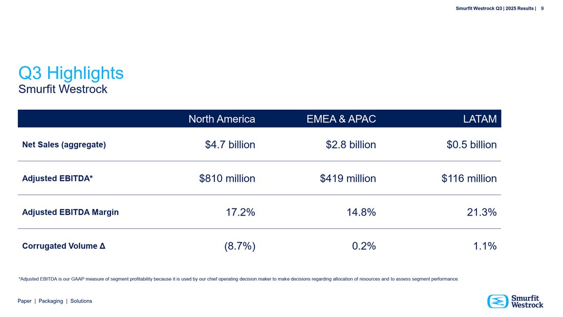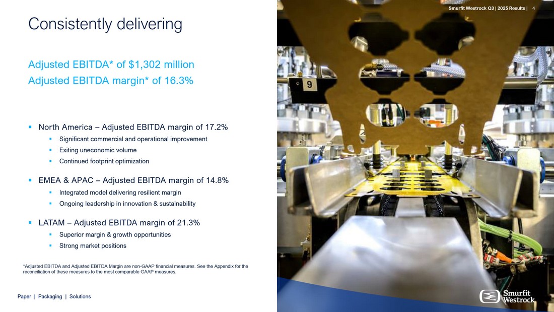 S m u r f i t We s t r o c k Q 3 | 202 5 R e s ul t s | 4 P a per | P a c k a g i n g | So l u t i ons   N o r th Am e ri c a – A d j u s t e d E B I T D A m a r gi n o f 17 . 2% Sign i f i c a nt c o mm e r c i a l and ope r at i o n a l i m p r o v e m e nt Ex i t i ng u n e c o n o m i c v o l ume Cont i n u e d f o o t p rint op t i m i z at i on   EME A & A P A C – A d j u s t e d E B I T D A m a r gi n o f 14 . 8% Int e g r at e d mod e l d e li v e ring r e s i li e nt m a r g in O ng o i ng l e ade r sh i p i n i n n o v at i o n & sus t a i nab i li t y   L A T A M – A d j u s t e d E B I T D A m a r gi n o f 21 . 3% S up e r i o r m a r gin & g r o w th oppo r tu n i t i es Str o ng ma r k e t p os i t i o ns Consis t ent l y deli v ering A d j us t e d E B I T D A * o f $1 , 3 0 2 m il li on A d j us t e d E B I T D A m a r g i n * o f 1 6 . 3% 4 * A d ju st ed EB I T D A and A d ju st ed EB I T D A M a r g in a r e no n - GA A P f in a n c ial m ea s u r e s. S ee t he A ppend i x f o r t he r e c on c i l ia t io n o f t he s e m ea s u r e s t o t he m o st c o m pa r ab le GA A P m ea s u r e s. S m u r f i t We s t r o c k Q 3 | 202 5 R e s ul t s |