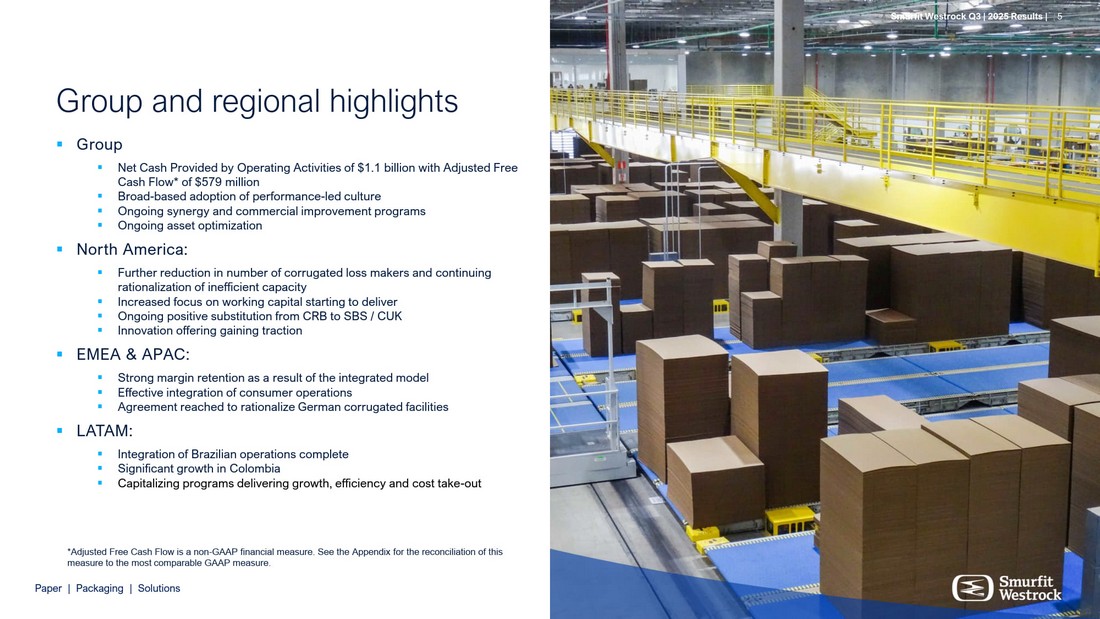 S m u r f i t We s t r o c k Q 3 | 202 5 R e s ul t s | 5 P a per | P a c k a g i n g | So l u t i ons 5   G r oup N e t Cash P r o vid e d b y O p era t i n g A c ti vi t i es o f $1.1 b illi on w i t h A d j us t e d Fre e Cash Fl o w * o f $57 9 m i lli on B r o a d - b ase d a d o p t i on o f p er f o r ma n c e - l e d cul t u re O ngoin g syn e rgy an d comm e rcia l i m p rov e me n t p rog r ams O n g o i n g asse t o p t i m i z a t i on   N o r th Am e ri c a: Fur t her re d uc t i on i n nu m b er o f cor r u g a t e d l os s maker s an d c on t i nu i n g ra t i ona l i z a t i on o f ine f f i cien t ca p aci t y Increase d f ocus on w o r k i n g ca p i t a l s t ar t i n g t o d el i v er O n g o i n g p os i t i v e subs t i t u t i on f r o m CR B t o SBS / C UK Inno v at i on o ff e r i ng gain i ng t ract i on   EME A & A P A C: St r o n g ma r g i n re t ent i on as a resul t o f t h e i n t egra t e d m o d el E ff e c t i v e i n t egra t i on o f consu m er o p era t i ons A g r e e men t reach e d t o ra t i ona l i z e G e r m an cor r u g a t e d f aci l i t i e s   L A T A M: Integra t ion o f Bra z i l ian o p e ra t ions com p lete S i g ni f i can t g r o w t h i n Col o mbia Ca p i t a li z i n g p r o g r am s d el i v e r i n g g r o w t h, e f f i ciency an d c os t t ak e - ou t G r oup and r egi o nal hi g hli g hts S m u r f i t We s t r o c k Q 3 | 202 5 R e s ul t s | * A d ju st ed F ree C a s h Flo w i s a no n - GA A P f in a n c ial m ea s u r e . S ee t he A ppend i x f o r t he r e c on c i l ia t io n o f t h i s m ea s u r e t o t he m o st c o m pa r ab le GA A P m ea s u r e.