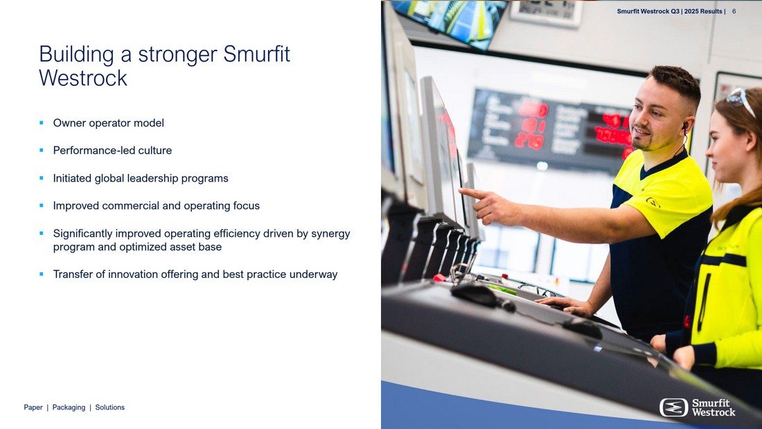 P a per | P a c k a g i n g | So l u t i ons S m u r f i t We s t r o c k Q 3 | 202 5 R e s ul t s | 6   O w n e r op e r a t o r m o del   P e r f orm a n c e - led c u l t u r e   I nit i a t ed g lob a l le a dership p r og r ams   I mp r o v ed c o m m e r c i a l a n d o pe r a t i n g f o c us   S i g nifi c ant l y imp r o v ed oper a tin g e ff i c ie n cy dr i v en b y s y ne r g y p r og r am and o p tim i zed a s s e t b a se   T r a nsf e r o f i nn o v a tio n o f f e r in g and b e st pr a c t i c e unde r w ay Bui l ding a st r onger Smurfit W est r ock S m u r f i t We s t r o c k Q 3 | 202 5 R e s ul t s | 6