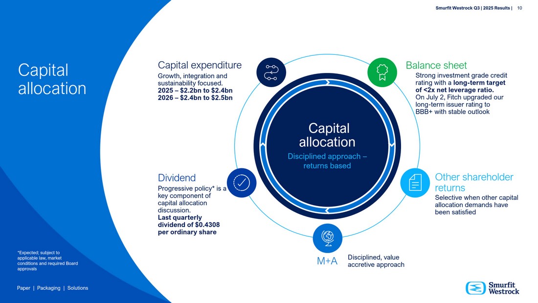P a per | P a c k a g i n g | So l u t i ons S m u r f i t We s t r o c k Q 3 | 202 5 R e s ul t s | 10 G r o w t h , i n t e g r a t i on a n d sus t ai n a b i li t y f o c us e d. 2025 – $ 2 . 2 b n t o $2 . 4bn 2026 – $2 . 4bn t o $2 . 5bn Pr og r e s s i v e pol i c y* i s a k e y c o mp on e n t o f c a p i t al a ll o c a t i on d i s c uss i on . L a st q u a r t er l y d i vi d e n d o f $ 0 . 4 3 0 8 p e r o r d i n ar y sh a re S t r ong i n v e s tm e n t g r a de c r ed i t r a t i ng w i t h a l o n g - t erm ta r g e t o f < 2x n e t l e v er a g e r a ti o . O n J u l y 2 , F i t c h u pgra d ed ou r l on g - t er m i ssu er r a t i ng t o BB B + w i t h s t a b l e ou t l ook S ele c t i v e wh en o t h er c a p i t al all o c a t i o n d eman d s h a v e bee n s a t i s fied Capi t al e x pendi t u re D ivide nd Bala n ce s h e et Othe r s h a r e h o l de r r e t u r ns Capital a l lo c a tion D isc i pli n ed app r oa c h – r e t u r ns b a sed D i s ci p l i n e d , v a l u e M+A a cc r e t i v e a p p r o a ch Capita l allo c a ti on * Expec t e d ; su b j e c t t o a pp lica b l e la w , ma r k e t c o n d i t i on s a n d re q u ire d Boa rd a p p r o vals P a per | P a c k a g i n g | So l u t i ons