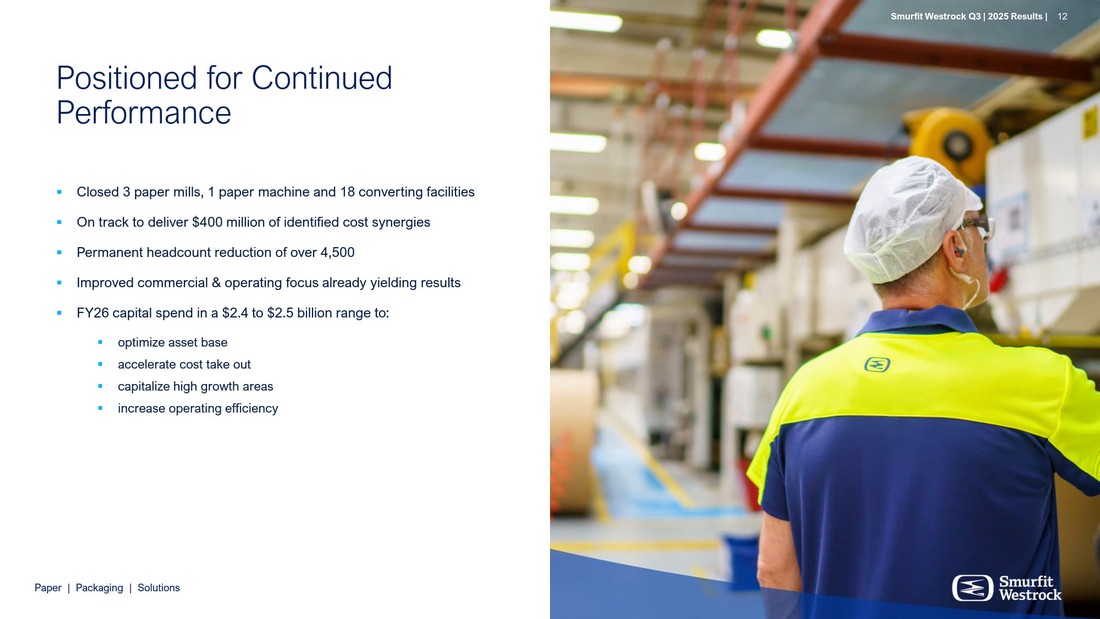 P a per | P a c k a g i n g | So l u t i ons S m u r f i t We s t r o c k Q 3 | 202 5 R e s ul t s | 12 C l os ed 3 p a per mi l l s , 1 p a per ma c h i n e a n d 18 c on v e r t i ng fa c ili t i e s O n t r a c k t o d e li v er $ 4 0 0 m illi o n o f i d e n t i fie d c o s t s yne r gies P er m a n e n t h ea d c oun t r e d u c t i on o f o v er 4 , 500 Imp r o v ed c o m m e r ci a l & o per a t i ng f o c us a l r ea d y y i el di ng r e s u l ts F Y 26 c a p i t al s pe n d i n a $2 . 4 t o $2 . 5 b i lli on r a ng e t o: op t i m i z e as s e t b ase a c c e l e r a te c o s t tak e o u t c a pi ta l i z e high g r o w th a r e as i n c r e as e ope r at i ng e ff i cie n cy P os i tioned f or Contin u ed P er f ormance S m u r f i t We s t r o c k Q 3 | 202 5 R e s ul t s | 12