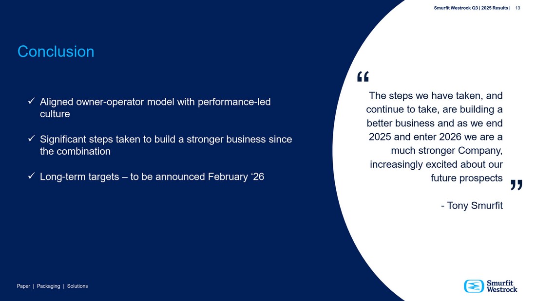 S m u r f i t We s t r o c k Q 3 | 2 025 R e s u l t s | 13 P a per | P a c k a g i n g | So l u t i ons Con c lu s ion ✓  Al i g n e d o w n e r - o p er a tor mo d e l w ith p e rforma n c e - l e d cu l ture ✓  Si g n i fica n t ste p s t ak e n to b u i l d a stro n g e r b u si n ess si n ce th e com b i n ati on ✓  Long - term tar g ets – to b e a n n o u n ce d Fe b ru a r y ‘ 26 S m u r f i t We s t r o c k Q 3 | 202 5 R e s ul t s | 13 “ T h e ste p s w e h a ve tak e n, a n d c o n ti n ue to tak e , a r e b u i l d i n g a b e t t er b us i n e ss a n d as w e e n d 2 0 2 5 a n d e n ter 202 6 w e ar e a muc h s t ro n g e r C o mp a n y , i n cr e a si n g l y e x cit e d abou t ou r futur e pr o sp e cts - T o n y Smurfit