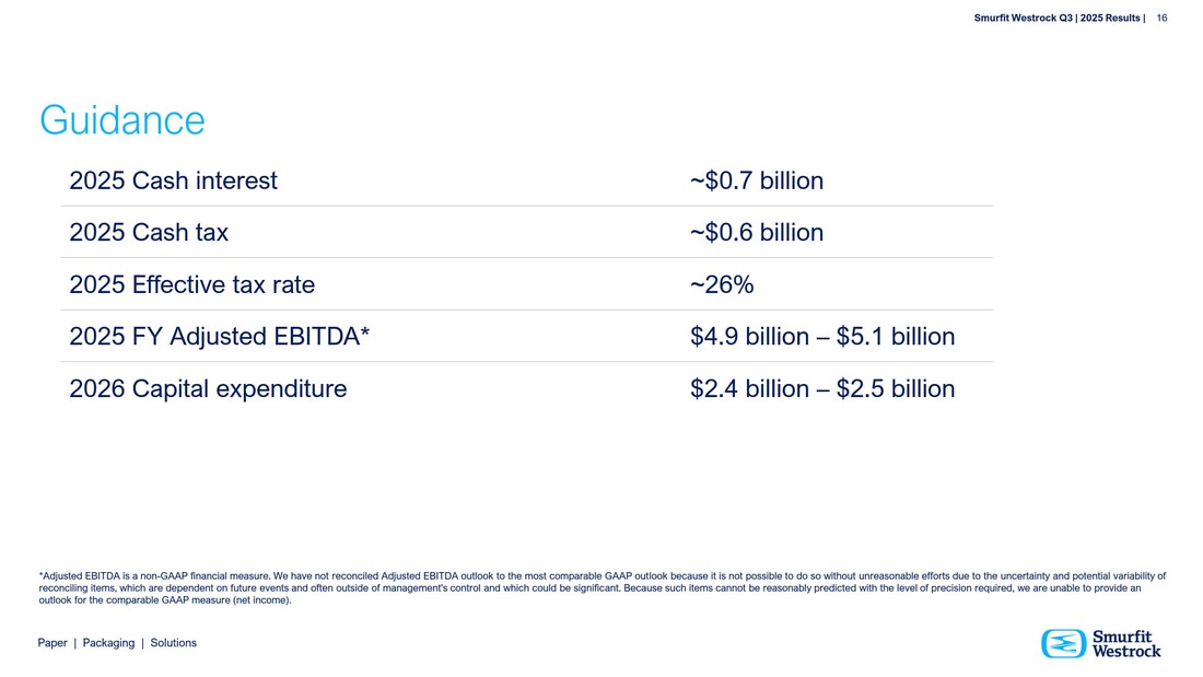 P a per | P a c k a g i n g | So l u t i ons S m u r f i t We s t r o c k Q 3 | 202 5 R e s ul t s | 16 202 5 C a s h in t e r e s t ~ $ 0. 7 b i l l i on 202 5 C a s h t a x ~ $ 0. 6 b i l l i on 202 5 E f f ec ti v e t a x r a t e ~ 2 6% 202 5 F Y A d just e d EBIT D A* $4 . 9 b i l l i on – $5 . 1 b i l l i on 202 6 Cap i tal e xp e nd i t u r e $2 . 4 b i l l i on – $2 . 5 b i l l i on Guidance * A d j u s t e d EB I T DA is a no n - GAA P f i n a n cial mea s u re . W e h av e no t rec on ciled A d j u s t e d EB I T DA ou t l oo k t o t h e m o s t c o m p a r a b l e GAA P ou t l oo k b e ca u s e i t is no t p o s s i b l e t o d o so w i t hou t un reaso n a b l e e ff o r t s d u e t o t h e un cer t ai n t y a n d p o t e n t ial varia b ili t y o f rec on cili n g i t e ms , w h ic h a r e d e p e n d e n t on f u t u re e v e n t s a n d o f t e n ou t si d e o f ma n ag e men t ' s c o n t r o l a n d w h ic h c o u l d b e signi f i c a n t . B e ca u s e su ch i t e ms ca n no t b e reaso n a b l y p re d ic t e d w i t h t h e l e v e l o f p recisio n re q u ire d , w e a r e un a b l e t o p r o vi d e a n ou t l oo k f o r t h e c o m p a r a b l e GAA P mea s u re ( n e t i n c o me).