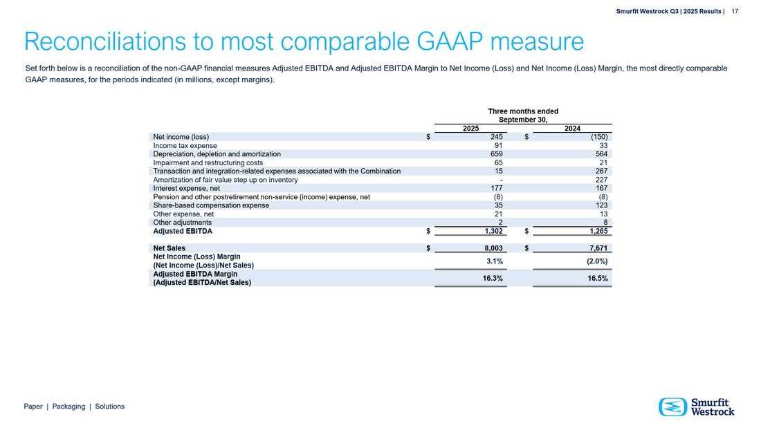 P a per | P a c k a g i n g | So l u t i ons S m u r f i t We s t r o c k Q 3 | 202 5 R e s ul t s | 17 R econcili a tions t o m o st com p arable GA A P me a su re S et f orth b e l o w i s a r e c o n c ili at i o n o f th e n o n - G AAP f i n a n c i a l m e a s ure s A d j u s te d EB I T D A a n d A d j u s te d EB I T D A M a r g i n to Net In c o m e ( L o ss ) a n d Net I n c o m e ( L o ss ) M a r g i n, th e m o s t d i r e c t l y c o m p a r a b l e G AAP m e a s ure s , f or th e p e r i o d s i n d i c at e d ( i n m illi o n s , e x c e p t m arg i n s). T h re e m o n th s e n d ed S e pt e m b e r 30, 202 5 2024 Ne t i n c o m e ( l o ss ) $ 24 5 $ ( 150) I n c o m e t a x e x p e n s e 9 1 33 De p r e c i a t i on , dep l e t i on and a m o rt i z a t i on 65 9 564 I m pa i r m en t and r e s tr u c t u r i n g c o s ts 6 5 21 T r an s a c t i on and i n t e g r a t i o n - r e l a t ed e x pen s e s a ss o c i a t e d w i t h t h e Co m b i na t i o n 1 5 267 A m o rt i z a t i on o f f a i r v a l ue s t e p up o n i n v en t o ry - 227 I n t e r e s t e x pen s e , ne t 17 7 167 P en s i on and o t h e r po s tr e t i r e m en t no n - s e r v i c e ( i n c o m e ) e x pen s e , ne t ( 8 ) ( 8) S ha r e - ba s ed c o m pen s a t i on e x pen s e 3 5 123 O t h e r e x pen s e , ne t 2 1 13 O t h e r ad j u s t m en ts 2 8 A dju s ted E B ITD A $ 1 , 3 0 2 $ 1 , 2 65 Net S a l e s $ 8 , 0 0 3 $ 7 , 6 71 Net I nc o m e (L o ss ) M a rgi n (Net I nc o m e (L o ss )/N e t S a l e s ) 3 . 1 % ( 2 . 0 %) A d j u s t e d EBITD A M a rgi n ( A d j u s t e d EBITD A /N e t S a l e s ) 16 . 3 % 16 . 5%