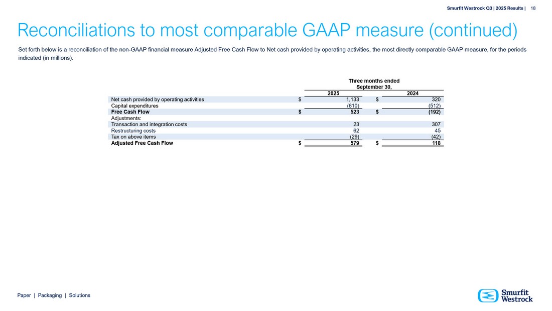 P a per | P a c k a g i n g | So l u t i ons S m u r f i t We s t r o c k Q 3 | 202 5 R e s ul t s | 18 R econcili a tions t o m o st com p arable GA A P me a su r e ( continued) S et f orth b e l o w i s a r e c o n c ili at i o n o f th e n o n - G AAP f i n a n c i a l m e a s ure A d j u s te d F r e e Ca s h F l o w to Net c a s h pro vi d e d b y o p erat i n g a c t iv i t i e s , th e m o s t d i r e c t l y c o m p a r a b l e G AAP m e a s ure, f or th e p e r i o d s i n d i c at e d ( i n m illi o n s ). T h re e m o n th s e n d ed S e pt em b e r 30, 202 5 2024 Ne t c a s h p r o v i ded b y o pe r a t i ng a c t i v i t i e s $ 1 , 1 3 3 $ 320 Ca p i t a l e x pend i t u r e s ( 610 ) ( 512) Fr ee Ca s h F l o w $ 52 3 $ ( 192) A d j u s t m en t s : T r an s a c t i on and i n t e g r a t i on c o s ts 2 3 307 R e s tr u c t u r i n g c o s ts 6 2 45 T a x on a bo v e i t e ms ( 29 ) ( 42) A d j u s t e d Fr ee Ca s h F l o w $ 57 9 $ 1 18