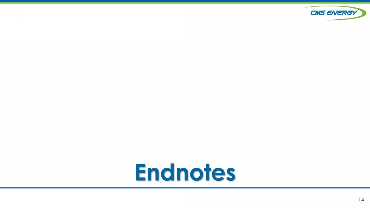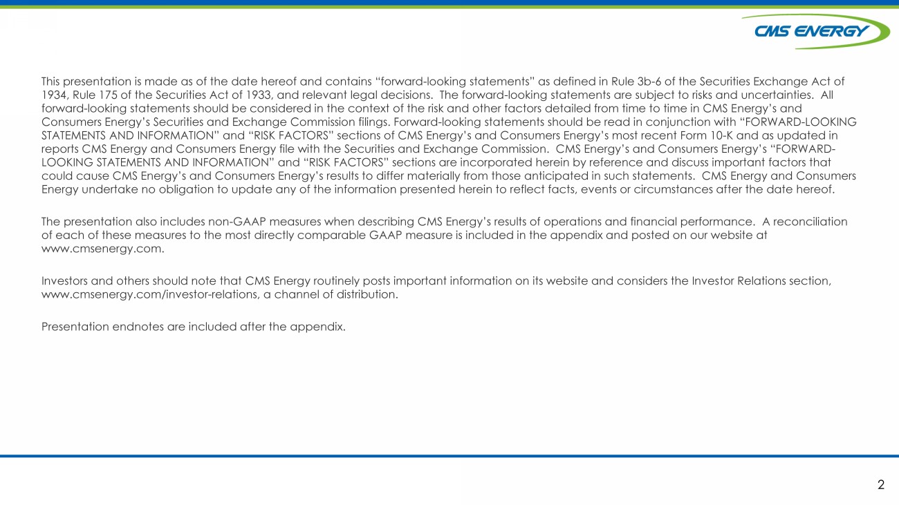 2 Enter “so what” if necessary – Century Gothic, Bold, Size 18 or smaller This presentation is made as of the date hereof and contains “forward - looking statements” as defined in Rule 3b - 6 of the Securit ies Exchange Act of 1934, Rule 175 of the Securities Act of 1933, and relevant legal decisions. The forward - looking statements are subject to risks and uncertainties. All forward - looking statements should be considered in the context of the risk and other factors detailed from time to time in CMS E nergy’s and Consumers Energy’s Securities and Exchange Commission filings. Forward - looking statements should be read in conjunction with “FO RWARD - LOOKING STATEMENTS AND INFORMATION” and “RISK FACTORS” sections of CMS Energy’s and Consumers Energy’s most recent Form 10 - K and as upda ted in reports CMS Energy and Consumers Energy file with the Securities and Exchange Commission. CMS Energy’s and Consumers Energy’ s “ FORWARD - LOOKING STATEMENTS AND INFORMATION” and “RISK FACTORS” sections are incorporated herein by reference and discuss important fa cto rs that could cause CMS Energy’s and Consumers Energy’s results to differ materially from those anticipated in such statements. CMS Ene rgy and Consumers Energy undertake no obligation to update any of the information presented herein to reflect facts, events or circumstances af ter the date hereof. The presentation also includes non - GAAP measures when describing CMS Energy’s results of operations and financial performance. A reconciliation of each of these measures to the most directly comparable GAAP measure is included in the appendix and posted on our website at www.cmsenergy.com. Investors and others should note that CMS Energy routinely posts important information on its website and considers the Inves tor Relations section, www.cmsenergy.com/investor - relations, a channel of distribution. Presentation endnotes are included after the appendix. 2