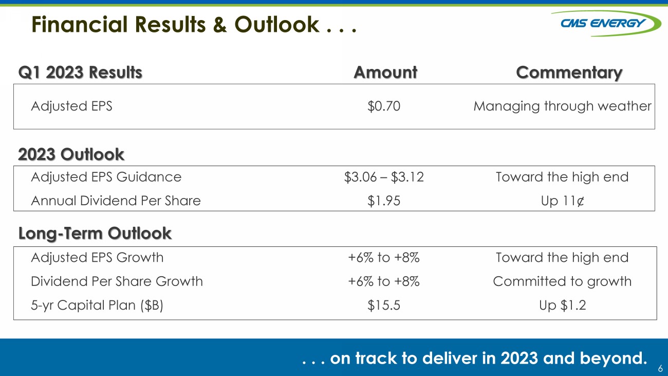 5 2023 Michigan’s Strong Regulatory Environment . . . . . . is ranked top - tier a and ensures forward - looking visibility. 2022 Integrated Resource Plan (IRP) Electric Q2 2023: File Rate Case Presentation endnotes are included after the appendix. Q4 2023: Expected Final Order Dec. 22 nd : Settlement Filed $161M, 9.9% ROE U - 21224 x x Jun. 23 rd : Settlement Approved U - 21090 Jul. 7th: Settlement Approved $170M, 9.9% ROE U - 21148 x Supportive Energy Law • Timely recovery of investments x Forward - looking test years x 10 - month rate cases x Earn authorized ROEs x Monthly fuel adjustment trackers (PSCR/GCR) • Supportive incentives x Constructive ROEs x 10.7% ROE for Renewable Portfolio Standard x Energy efficiency incentive (>$50M/yr) x FCM adder on PPAs • Appointed Commissioners Gas Q4 2022: Filed Rate Case Jan. 19 th Approved
