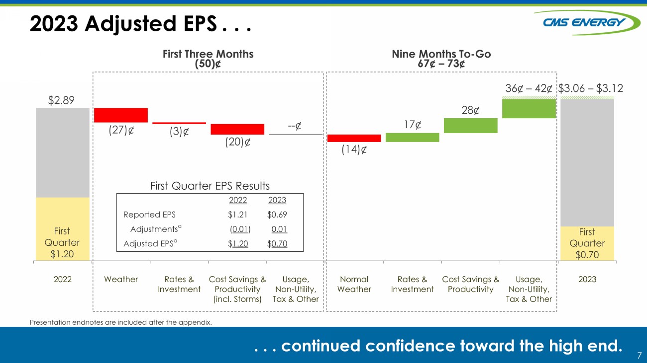 6 Commentary Amount Financial Results & Outlook . . . . . . o n track to deliver in 2023 and beyond. Long - Term Outlook 2023 Outlook Q1 2023 Results Adjusted EPS $0.70 Managing through weather Adjusted EPS Guidance Annual Dividend Per Share $3.06 – $3.12 $1.95 Toward the high end Up 11¢ Adjusted EPS Growth Dividend Per Share Growth 5 - yr Capital Plan ($B) +6% to +8% +6% to +8% $15.5 Toward the high end Committed to growth Up $1.2