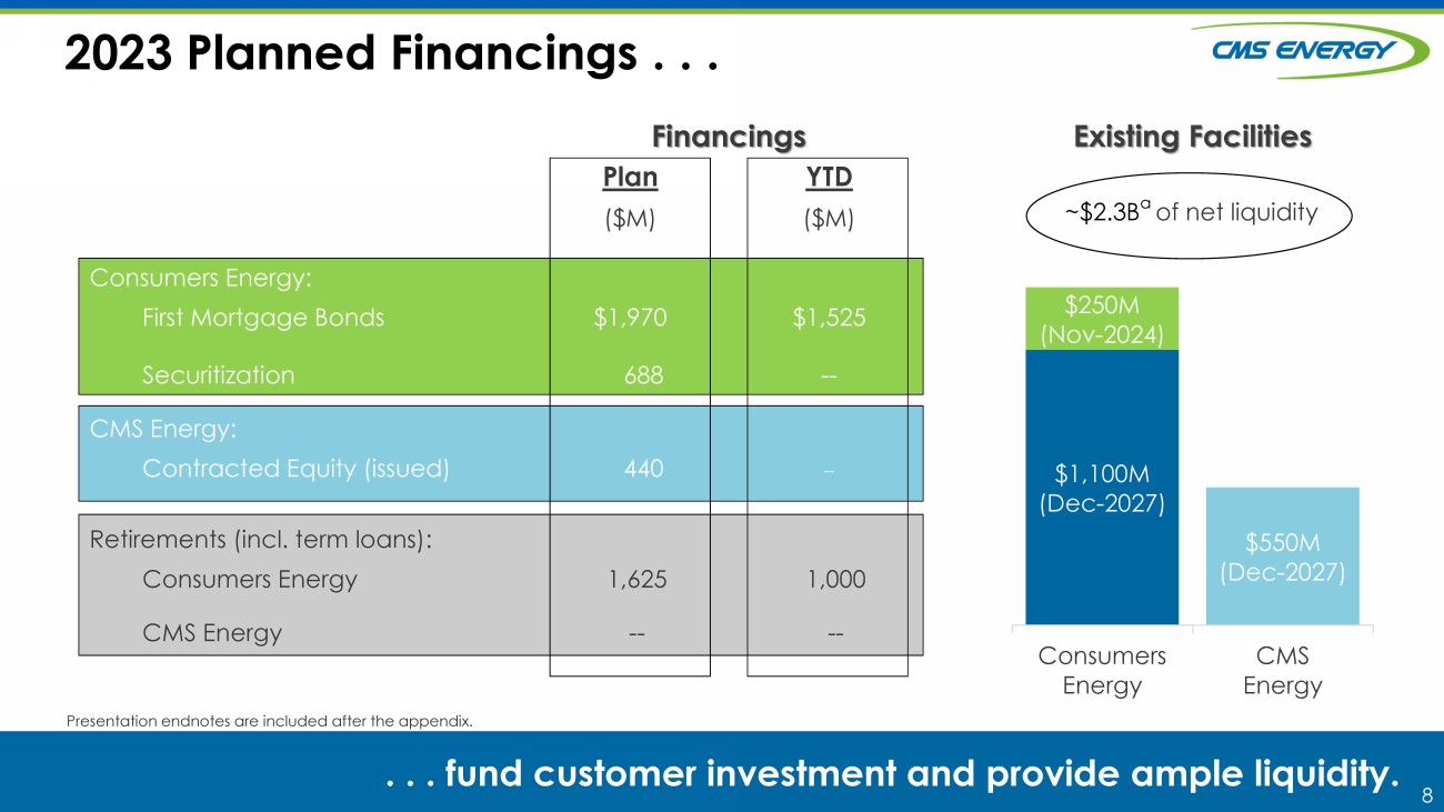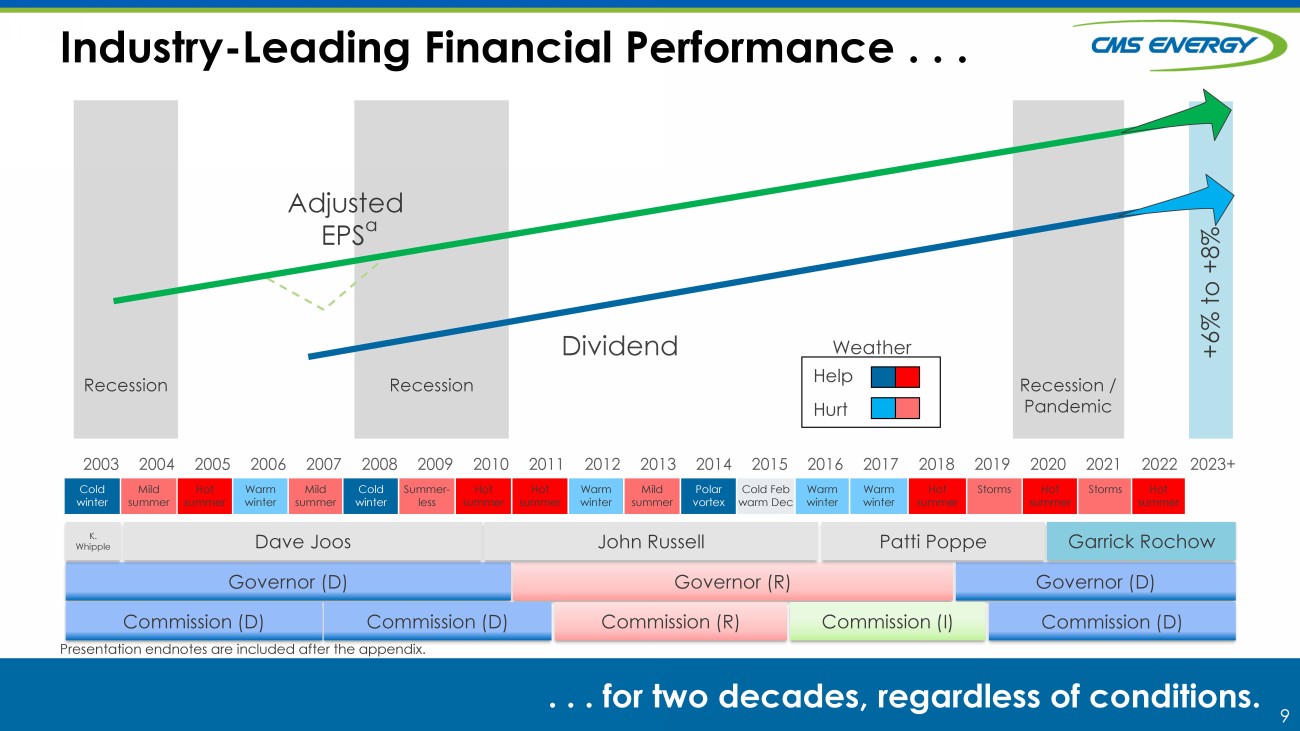 8 Plan YTD ($M) ($M) Consumers Energy: First Mortgage Bonds Securitization $1,970 688 $1,525 -- CMS Energy: Contracted Equity (issued) 440 -- Retirements (incl. term loans): Consumers Energy 1,625 1,000 CMS Energy -- -- Existing Facilities $1,100M (Dec - 2027) $550M (Dec - 2027) $250M (Nov - 2024) Consumers Energy CMS Energy Financings 2023 Planned Financings . . . . . . fund customer investment and provide ample liquidity. Presentation endnotes are included after the appendix. ~$2 .3 B a of net liquidity
