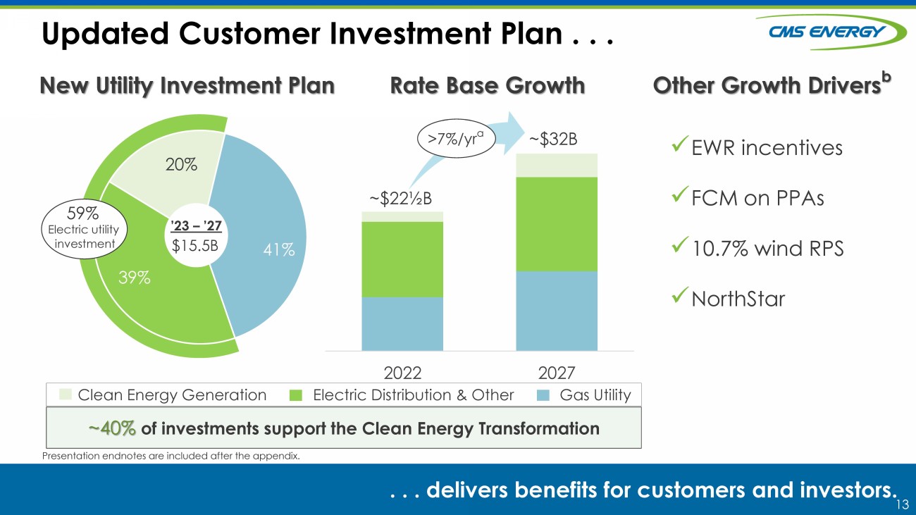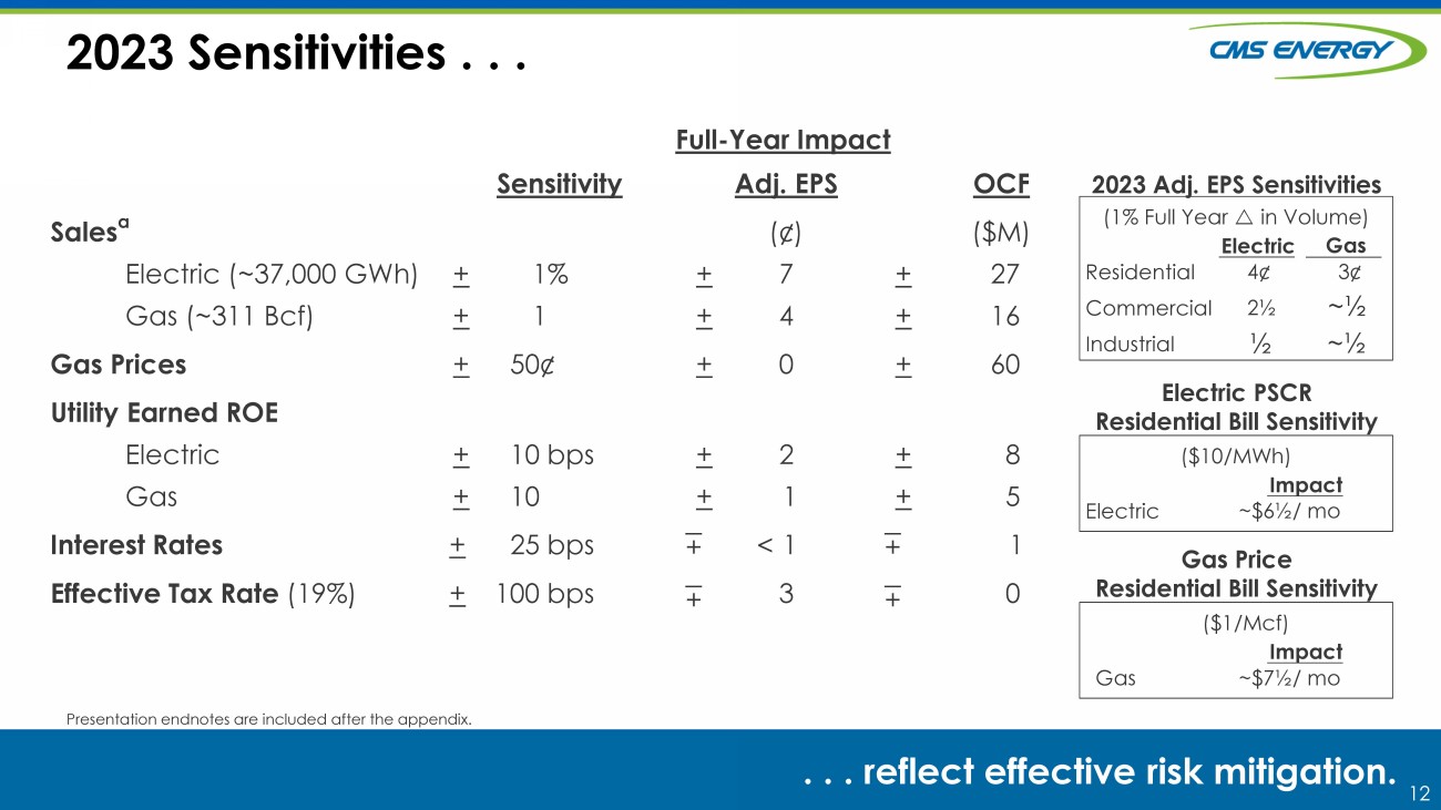 12 2023 Sensitivities . . . . . . r eflect effective risk mitigation. Presentation endnotes are included after the appendix. Full - Year Impact Sensitivity Adj. EPS OCF Sales a Electric (~37,000 GWh) Gas (~311 Bcf) + + 1% 1 + + ( ¢) 7 4 + + ($M) 27 16 Gas Prices + 50 ¢ + 0 + 60 Utility Earned ROE Electric Gas + + 10 bps 10 + + 2 1 + + 8 5 Interest Rates + 25 bps 1 1 Effective Tax Rate (19%) + 100 bps 3 0 + + + + Electric Residential Commercial Industrial 4¢ 2½ 3 ¢ (1% Full Year in Volume) 2023 Adj. EPS Sensitivities Gas ½ ~½ ~½ Impact Electric ~$6½/ mo ($10/MWh) Electric PSCR Residential Bill Sensitivity Impact Gas ($1/Mcf) Gas Price Residential Bill Sensitivity ~$7½/ mo <