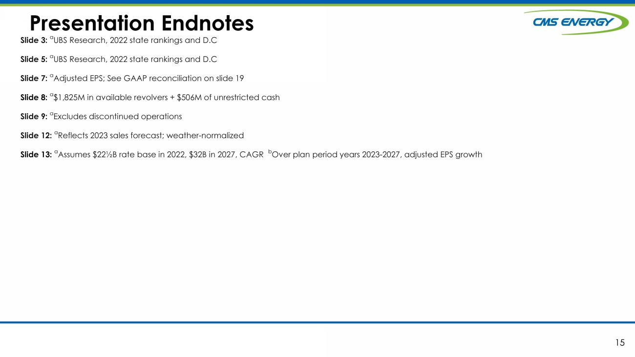 15 15 Slide 3: a UBS Research, 2022 state rankings and D.C Slide 5: a UBS Research, 2022 state rankings and D.C Slide 7: a Adjusted EPS; See GAAP reconciliation on slide 19 Slide 8: a $1,825M in available revolvers + $506M of unrestricted cash Slide 9: a Excludes discontinued operations Slide 12: a Reflects 2023 sales forecast; weather - normalized Slide 13: a Assumes $22½B rate base in 2022, $32B in 2027, CAGR b Over plan period years 2023 - 2027, adjusted EPS growth Presentation Endnotes
