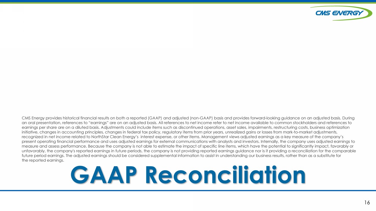 16 16 GAAP Reconciliation CMS Energy provides historical financial results on both a reported (GAAP) and adjusted (non - GAAP) basis and provides forward - lo oking guidance on an adjusted basis. During an oral presentation, references to “earnings” are on an adjusted basis. All references to net income refer to net income availa ble to common stockholders and references to earnings per share are on a diluted basis. Adjustments could include items such as discontinued operations, asset sales, impairm ents, restructuring costs, business optimization initiative, changes in accounting principles, changes in federal tax policy, regulatory items from prior years, unrealized gains or losses from mark - to - market adjustments, recognized in net income related to NorthStar Clean Energy’s interest expense, or other items. Management views adjusted earnin gs as a key measure of the company’s present operating financial performance and uses adjusted earnings for external communications with analysts and investors. Inte rnally, the company uses adjusted earnings to measure and assess performance. Because the company is not able to estimate the impact of specific line items, which have the po tential to significantly impact, favorably or unfavorably, the company's reported earnings in future periods, the company is not providing reported earnings guidance nor i s i t providing a reconciliation for the comparable future period earnings. The adjusted earnings should be considered supplemental information to assist in understanding our bu sin ess results, rather than as a substitute for the reported earnings.