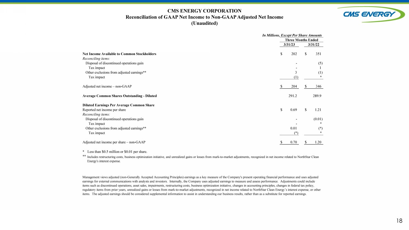 17 CMS ENERGY CORPORATION Reconciliation of GAAP EPS to Non - GAAP Adjusted EPS by Segment (Unaudited) Electric Utility Reported net income per share $ 0.23 $ 0.58 Reconciling items: Other exclusions from adjusted earnings 0.01 - Tax impact (*) - Adjusted net income per share – non-GAAP $ 0.24 $ 0.58 Gas Utility Reported net income per share $ 0.53 $ 0.74 Reconciling items: Other exclusions from adjusted earnings * - Tax impact (*) - Adjusted net income per share – non-GAAP $ 0.53 $ 0.74 NorthStar Clean Energy Reported net income per share $ 0.03 $ 0.03 Reconciling items: Other exclusions from adjusted earnings - (*) Tax impact - * Adjusted net income per share – non-GAAP $ 0.03 $ 0.03 Corporate Interest and Other Reported net loss per share $ (0.10) $ (0.15) Reconciling items: Other exclusions from adjusted earnings - - Tax impact - - Adjusted net loss per share – non-GAAP $ (0.10) $ (0.15) Discontinued Operations Reported net income per share $ - $ 0.01 Reconciling items: Disposal of discontinued operations gain - (0.01) Tax impact - * Adjusted net income per share – non-GAAP $ - $ - Consolidated Reported net income per share $ 0.69 $ 1.21 Reconciling items: Disposal of discontinued operations gain - (0.01) Tax impact - * Other exclusions from adjusted earnings 0.01 (*) Tax impact (*) * Adjusted net income per share – non-GAAP $ 0.70 $ 1.20 Average Common Shares Outstanding – Diluted 291.2 289.9 * Less than $0.01 per share. In Millions, Except Per Share Amounts Three Months Ended 3/31/23 3/31/22