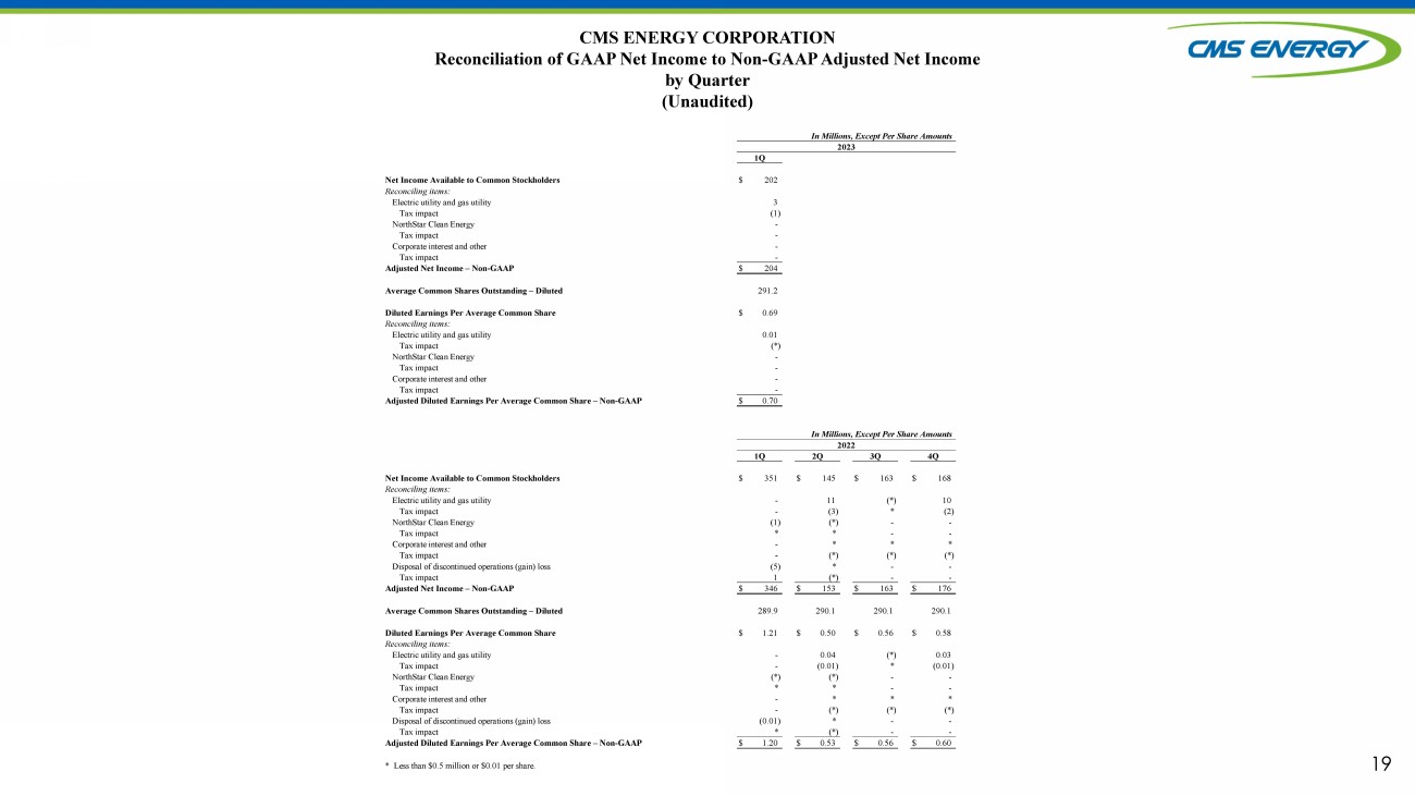 18 CMS ENERGY CORPORATION Reconciliation of GAAP Net Income to Non - GAAP Adjusted Net Income (Unaudited) Net Income Available to Common Stockholders $ 202 $ 351 Reconciling items: Disposal of discontinued operations gain - (5) Tax impact - 1 Other exclusions from adjusted earnings** 3 (1) Tax impact (1) * Adjusted net income – non-GAAP $ 204 $ 346 Average Common Shares Outstanding - Diluted 291.2 289.9 Diluted Earnings Per Average Common Share Reported net income per share $ 0.69 $ 1.21 Reconciling items: Disposal of discontinued operations gain - (0.01) Tax impact - * Other exclusions from adjusted earnings** 0.01 (*) Tax impact (*) * Adjusted net income per share – non-GAAP $ 0.70 $ 1.20 * Less than $0.5 million or $0.01 per share. ** Includes restructuring costs, business optimization initiative, and unrealized gains or losses from mark-to-market adjustments, recognized in net income related to NorthStar Clean Energy's interest expense. Management views adjusted (non-Generally Accepted Accounting Principles) earnings as a key measure of the Company's present operating financial performance and uses adjusted earnings for external communications with analysts and investors. Internally, the Company uses adjusted earnings to measure and assess performance. Adjustments could include items such as discontinued operations, asset sales, impairments, restructuring costs, business optimization initiative, changes in accounting principles, changes in federal tax policy, regulatory items from prior years, unrealized gains or losses from mark-to-market adjustments, recognized in net income related to NorthStar Clean Energy’s interest expense, or other items. The adjusted earnings should be considered supplemental information to assist in understanding our business results, rather than as a substitute for reported earnings. In Millions, Except Per Share Amounts Three Months Ended 3/31/23 3/31/22