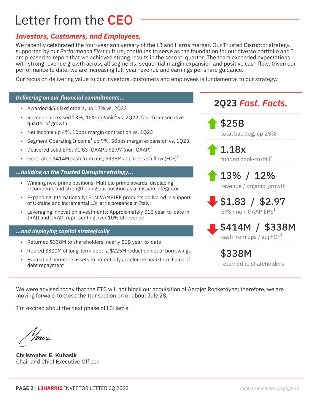 Letter from the CEO PAGE 2 | L3HARRIS INVESTOR LETTER 2Q 2023 Refer to endnotes on page 14 We were advised today that the FTC will not block our acquisition of Aerojet Rocketdyne; therefore, we are moving forward to close the transaction on or about July 28. I’m excited about the next phase of L3Harris. Christopher E. Kubasik Chair and Chief Executive Officer Investors, Customers, and Employees, We recently celebrated the four-year anniversary of the L3 and Harris merger. Our Trusted Disruptor strategy, supported by our Performance First culture, continues to serve as the foundation for our diverse portfolio and I am pleased to report that we achieved strong results in the second quarter. The team exceeded expectations with strong revenue growth across all segments, sequential margin expansion and positive cash flow. Given our performance to date, we are increasing full-year revenue and earnings per share guidance. Our focus on delivering value to our investors, customers and employees is fundamental to our strategy. Delivering on our financial commitments... • Awarded $5.6B of orders, up 17% vs. 2Q22 • Revenue increased 13%, 12% organic1 vs. 2Q22; fourth consecutive quarter of growth • Net income up 4%, 10bps margin contraction vs. 1Q23 • Segment Operating Income1 up 9%, 50bps margin expansion vs. 1Q23 • Delivered solid EPS: $1.83 (GAAP); $2.97 (non-GAAP)1 • Generated $414M cash from ops; $338M adj free cash flow (FCF)1 ...building on the Trusted Disruptor strategy... • Winning new prime positions: Multiple prime awards, displacing incumbents and strengthening our position as a mission integrator • Expanding internationally: First VAMPIRE products delivered in support of Ukraine and incremental L3Harris presence in Italy • Leveraging innovation investments: Approximately $1B year-to-date in IRAD and CRAD, representing over 10% of revenue ...and deploying capital strategically • Returned $338M to shareholders, nearly $1B year-to-date • Retired $800M of long-term debt; a $225M reduction net of borrowings • Evaluating non-core assets to potentially accelerate near-term focus of debt repayment 2Q23 Fast. Facts. revenue / organic1 growth funded book-to-bill1 EPS / non-GAAP EPS1 cash from ops / adj FCF1 returned to shareholders $25B 13% / 12% $1.83 / $2.97 $414M / $338M $338M 1.18x total backlog, up 25%