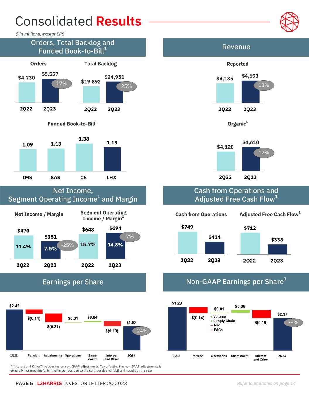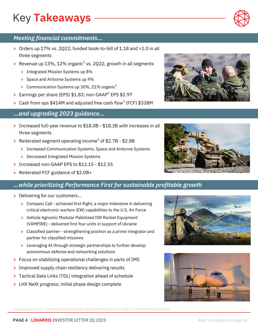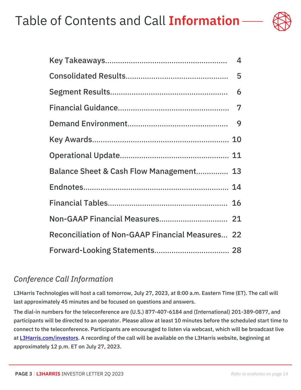 PAGE 3 | L3HARRIS INVESTOR LETTER 2Q 2023 Refer to endnotes on page 14 Key Takeaways......................................................... 4 Consolidated Results................................................ 5 Segment Results....................................................... 6 Financial Guidance.................................................... 7 Demand Environment............................................... 9 Key Awards................................................................ 10 Operational Update................................................... 11 Balance Sheet & Cash Flow Management............... 13 Endnotes.................................................................... 14 Financial Tables........................................................ 16 Non-GAAP Financial Measures................................ 21 Reconciliation of Non-GAAP Financial Measures... 22 Forward-Looking Statements................................... 28 Table of Contents and Call Information Conference Call Information L3Harris Technologies will host a call tomorrow, July 27, 2023, at 8:00 a.m. Eastern Time (ET). The call will last approximately 45 minutes and be focused on questions and answers. The dial-in numbers for the teleconference are (U.S.) 877-407-6184 and (International) 201-389-0877, and participants will be directed to an operator. Please allow at least 10 minutes before the scheduled start time to connect to the teleconference. Participants are encouraged to listen via webcast, which will be broadcast live at L3Harris.com/investors. A recording of the call will be available on the L3Harris website, beginning at approximately 12 p.m. ET on July 27, 2023.