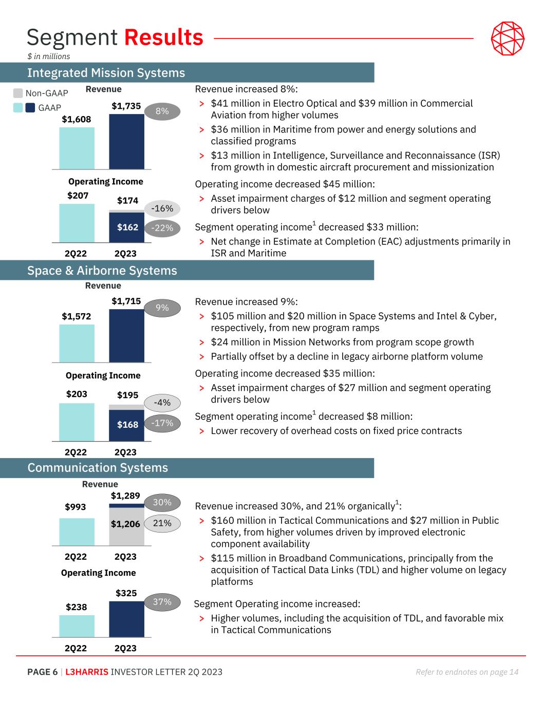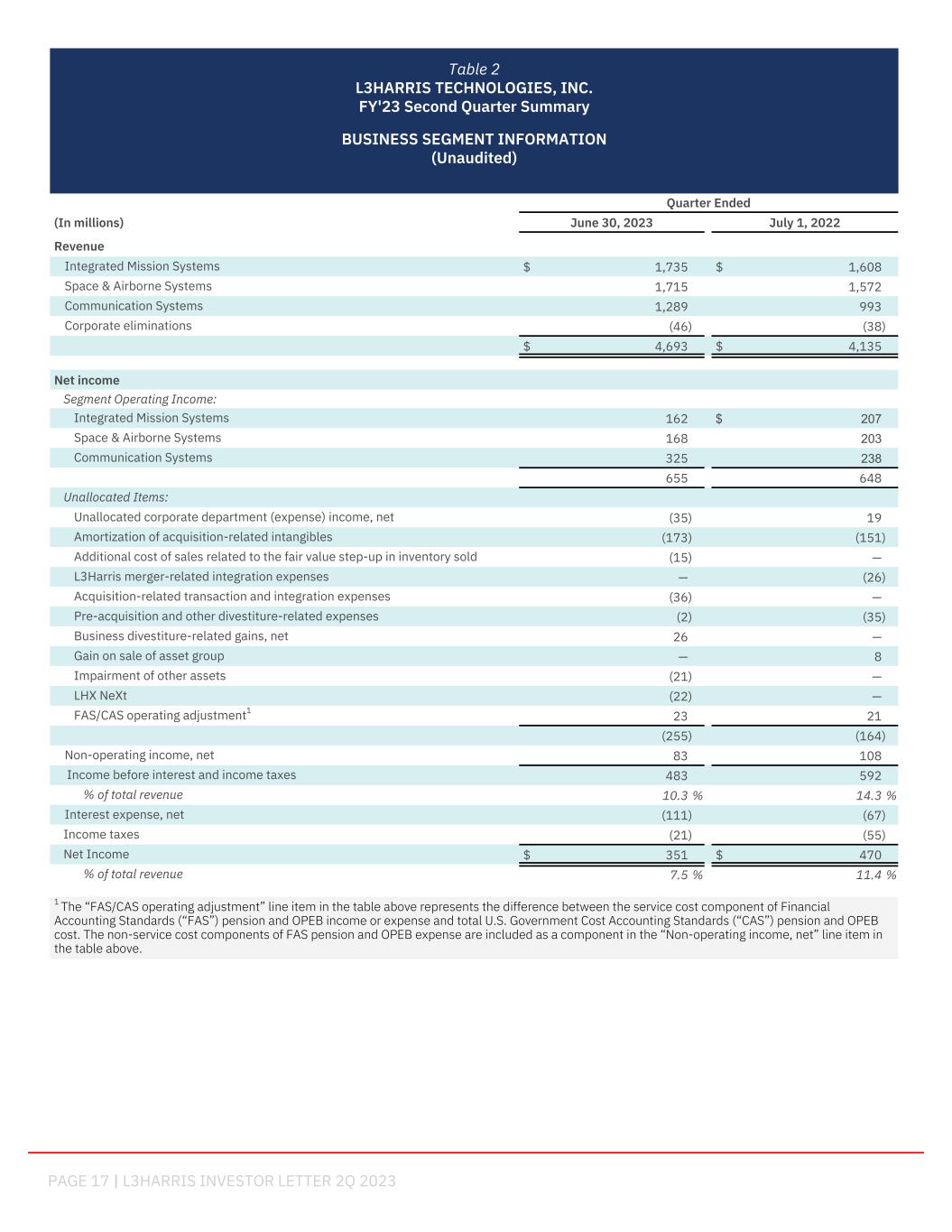 PAGE 17 | L3HARRIS INVESTOR LETTER 2Q 2023   Quarter Ended (In millions) June 30, 2023 July 1, 2022 Revenue Integrated Mission Systems $ 1,735 $ 1,608 Space & Airborne Systems 1,715 1,572 Communication Systems 1,289 993 Corporate eliminations (46) (38) $ 4,693 $ 4,135 Net income Segment Operating Income: Integrated Mission Systems 162 $ 207 Space & Airborne Systems 168 203 Communication Systems 325 238 655 648 Unallocated Items: Unallocated corporate department (expense) income, net (35) 19 Amortization of acquisition-related intangibles (173) (151) Additional cost of sales related to the fair value step-up in inventory sold (15) — L3Harris merger-related integration expenses — (26) Acquisition-related transaction and integration expenses (36) — Pre-acquisition and other divestiture-related expenses (2) (35) Business divestiture-related gains, net 26 — Gain on sale of asset group — 8 Impairment of other assets (21) — LHX NeXt (22) — FAS/CAS operating adjustment1 23 21 (255) (164) Non-operating income, net 83 108 Income before interest and income taxes 483 592 % of total revenue 10.3 % 14.3 % Interest expense, net (111) (67) Income taxes (21) (55) Net Income $ 351 $ 470 % of total revenue 7.5 % 11.4 % 1 The “FAS/CAS operating adjustment” line item in the table above represents the difference between the service cost component of Financial Accounting Standards (“FAS”) pension and OPEB income or expense and total U.S. Government Cost Accounting Standards (“CAS”) pension and OPEB cost. The non-service cost components of FAS pension and OPEB expense are included as a component in the “Non-operating income, net” line item in the table above. Table 2 L3HARRIS TECHNOLOGIES, INC. FY'23 Second Quarter Summary BUSINESS SEGMENT INFORMATION (Unaudited) support