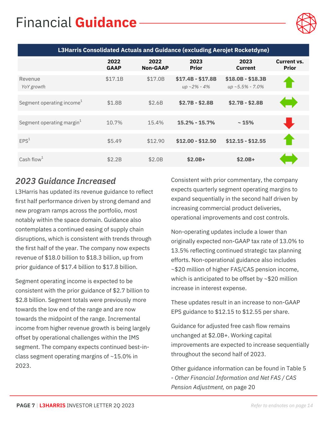 PAGE 7 | L3HARRIS INVESTOR LETTER 2Q 2023 Refer to endnotes on page 14 2023 Guidance Increased L3Harris has updated its revenue guidance to reflect first half performance driven by strong demand and new program ramps across the portfolio, most notably within the space domain. Guidance also contemplates a continued easing of supply chain disruptions, which is consistent with trends through the first half of the year. The company now expects revenue of $18.0 billion to $18.3 billion, up from prior guidance of $17.4 billion to $17.8 billion. Segment operating income is expected to be consistent with the prior guidance of $2.7 billion to $2.8 billion. Segment totals were previously more towards the low end of the range and are now towards the midpoint of the range. Incremental income from higher revenue growth is being largely offset by operational challenges within the IMS segment. The company expects continued best-in- class segment operating margins of ~15.0% in 2023. L3Harris Consolidated Actuals and Guidance (excluding Aerojet Rocketdyne) 2022 GAAP 2022 Non-GAAP 2023 Prior 2023 Current Current vs. Prior Revenue YoY growth $17.1B $17.0B $17.4B - $17.8B up ~2% - 4% $18.0B - $18.3B up ~5.5% - 7.0% Segment operating income1 $1.8B $2.6B $2.7B - $2.8B $2.7B - $2.8B Segment operating margin1 10.7% 15.4% 15.2% - 15.7% ~ 15% EPS1 $5.49 $12.90 $12.00 - $12.50 $12.15 - $12.55 Cash flow1 $2.2B $2.0B $2.0B+ $2.0B+ Financial Guidance Consistent with prior commentary, the company expects quarterly segment operating margins to expand sequentially in the second half driven by increasing commercial product deliveries, operational improvements and cost controls. Non-operating updates include a lower than originally expected non-GAAP tax rate of 13.0% to 13.5% reflecting continued strategic tax planning efforts. Non-operational guidance also includes ~$20 million of higher FAS/CAS pension income, which is anticipated to be offset by ~$20 million increase in interest expense. These updates result in an increase to non-GAAP EPS guidance to $12.15 to $12.55 per share. Guidance for adjusted free cash flow remains unchanged at $2.0B+. Working capital improvements are expected to increase sequentially throughout the second half of 2023. Other guidance information can be found in Table 5 - Other Financial Information and Net FAS / CAS Pension Adjustment, on page 20