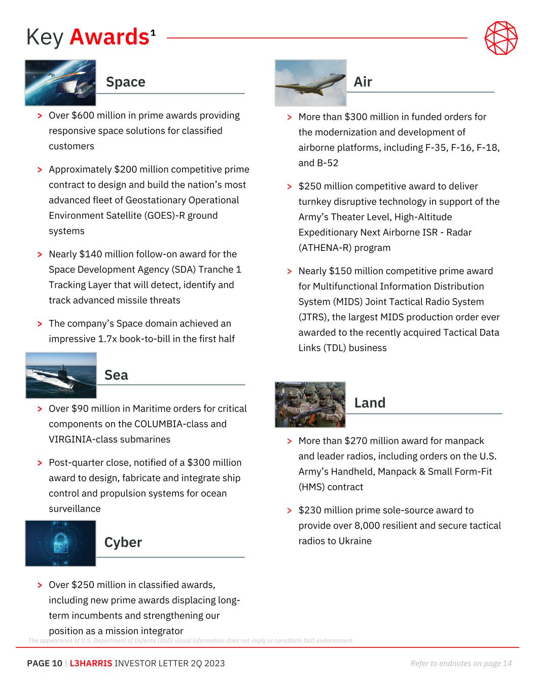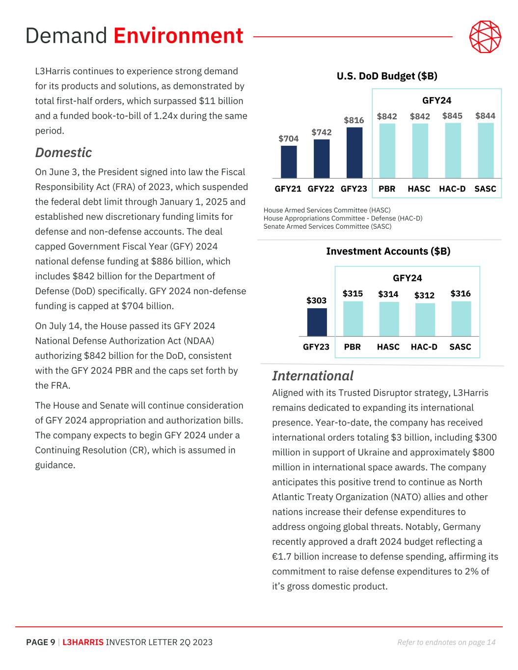 PAGE 9 | L3HARRIS INVESTOR LETTER 2Q 2023 Refer to endnotes on page 14 U.S. DoD Budget ($B) $704 $742 $816 $842 $842 $845 $844 GFY21 GFY22 GFY23 PBR HASC HAC-D SASC GFY24 L3Harris continues to experience strong demand for its products and solutions, as demonstrated by total first-half orders, which surpassed $11 billion and a funded book-to-bill of 1.24x during the same period. Domestic On June 3, the President signed into law the Fiscal Responsibility Act (FRA) of 2023, which suspended the federal debt limit through January 1, 2025 and established new discretionary funding limits for defense and non-defense accounts. The deal capped Government Fiscal Year (GFY) 2024 national defense funding at $886 billion, which includes $842 billion for the Department of Defense (DoD) specifically. GFY 2024 non-defense funding is capped at $704 billion. On July 14, the House passed its GFY 2024 National Defense Authorization Act (NDAA) authorizing $842 billion for the DoD, consistent with the GFY 2024 PBR and the caps set forth by the FRA. The House and Senate will continue consideration of GFY 2024 appropriation and authorization bills. The company expects to begin GFY 2024 under a Continuing Resolution (CR), which is assumed in guidance. Demand Environment House Armed Services Committee (HASC) House Appropriations Committee - Defense (HAC-D) Senate Armed Services Committee (SASC) International Aligned with its Trusted Disruptor strategy, L3Harris remains dedicated to expanding its international presence. Year-to-date, the company has received international orders totaling $3 billion, including $300 million in support of Ukraine and approximately $800 million in international space awards. The company anticipates this positive trend to continue as North Atlantic Treaty Organization (NATO) allies and other nations increase their defense expenditures to address ongoing global threats. Notably, Germany recently approved a draft 2024 budget reflecting a €1.7 billion increase to defense spending, affirming its commitment to raise defense expenditures to 2% of it’s gross domestic product. Investment Accounts ($B) $303 $315 $314 $312 $316 GFY23 PBR HASC HAC-D SASC GFY24