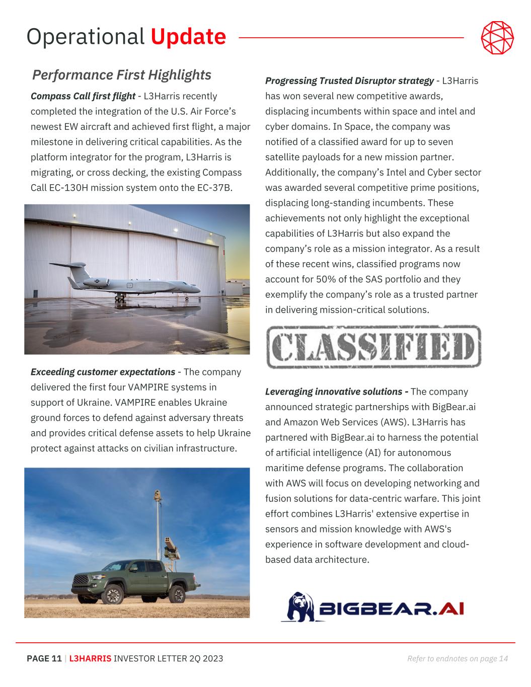 PAGE 11 | L3HARRIS INVESTOR LETTER 2Q 2023 Refer to endnotes on page 14 Progressing Trusted Disruptor strategy - L3Harris has won several new competitive awards, displacing incumbents within space and intel and cyber domains. In Space, the company was notified of a classified award for up to seven satellite payloads for a new mission partner. Additionally, the company’s Intel and Cyber sector was awarded several competitive prime positions, displacing long-standing incumbents. These achievements not only highlight the exceptional capabilities of L3Harris but also expand the company’s role as a mission integrator. As a result of these recent wins, classified programs now account for 50% of the SAS portfolio and they exemplify the company’s role as a trusted partner in delivering mission-critical solutions. Leveraging innovative solutions - The company announced strategic partnerships with BigBear.ai and Amazon Web Services (AWS). L3Harris has partnered with BigBear.ai to harness the potential of artificial intelligence (AI) for autonomous maritime defense programs. The collaboration with AWS will focus on developing networking and fusion solutions for data-centric warfare. This joint effort combines L3Harris' extensive expertise in sensors and mission knowledge with AWS's experience in software development and cloud- based data architecture. Compass Call first flight - L3Harris recently completed the integration of the U.S. Air Force’s newest EW aircraft and achieved first flight, a major milestone in delivering critical capabilities. As the platform integrator for the program, L3Harris is migrating, or cross decking, the existing Compass Call EC-130H mission system onto the EC-37B. Exceeding customer expectations - The company delivered the first four VAMPIRE systems in support of Ukraine. VAMPIRE enables Ukraine ground forces to defend against adversary threats and provides critical defense assets to help Ukraine protect against attacks on civilian infrastructure. Performance First Highlights Operational Update