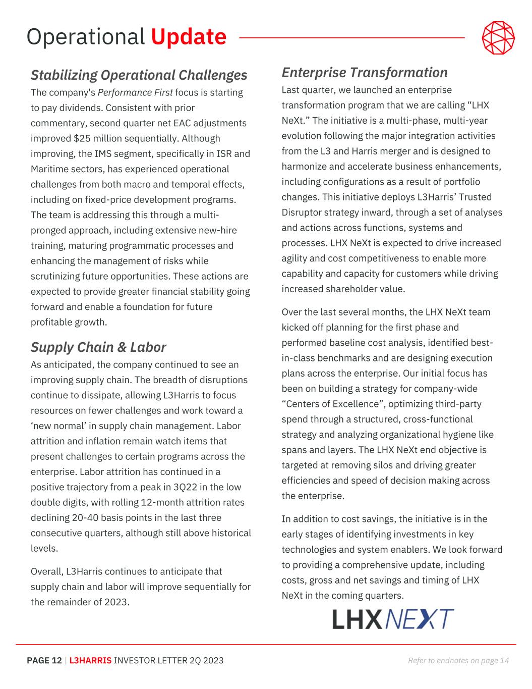 PAGE 12 | L3HARRIS INVESTOR LETTER 2Q 2023 Refer to endnotes on page 14 Stabilizing Operational Challenges The company's Performance First focus is starting to pay dividends. Consistent with prior commentary, second quarter net EAC adjustments improved $25 million sequentially. Although improving, the IMS segment, specifically in ISR and Maritime sectors, has experienced operational challenges from both macro and temporal effects, including on fixed-price development programs. The team is addressing this through a multi- pronged approach, including extensive new-hire training, maturing programmatic processes and enhancing the management of risks while scrutinizing future opportunities. These actions are expected to provide greater financial stability going forward and enable a foundation for future profitable growth. Supply Chain & Labor As anticipated, the company continued to see an improving supply chain. The breadth of disruptions continue to dissipate, allowing L3Harris to focus resources on fewer challenges and work toward a ‘new normal’ in supply chain management. Labor attrition and inflation remain watch items that present challenges to certain programs across the enterprise. Labor attrition has continued in a positive trajectory from a peak in 3Q22 in the low double digits, with rolling 12-month attrition rates declining 20-40 basis points in the last three consecutive quarters, although still above historical levels. Overall, L3Harris continues to anticipate that supply chain and labor will improve sequentially for the remainder of 2023. Enterprise Transformation Last quarter, we launched an enterprise transformation program that we are calling “LHX NeXt.” The initiative is a multi-phase, multi-year evolution following the major integration activities from the L3 and Harris merger and is designed to harmonize and accelerate business enhancements, including configurations as a result of portfolio changes. This initiative deploys L3Harris’ Trusted Disruptor strategy inward, through a set of analyses and actions across functions, systems and processes. LHX NeXt is expected to drive increased agility and cost competitiveness to enable more capability and capacity for customers while driving increased shareholder value. Over the last several months, the LHX NeXt team kicked off planning for the first phase and performed baseline cost analysis, identified best- in-class benchmarks and are designing execution plans across the enterprise. Our initial focus has been on building a strategy for company-wide “Centers of Excellence”, optimizing third-party spend through a structured, cross-functional strategy and analyzing organizational hygiene like spans and layers. The LHX NeXt end objective is targeted at removing silos and driving greater efficiencies and speed of decision making across the enterprise. In addition to cost savings, the initiative is in the early stages of identifying investments in key technologies and system enablers. We look forward to providing a comprehensive update, including costs, gross and net savings and timing of LHX NeXt in the coming quarters. Operational Update