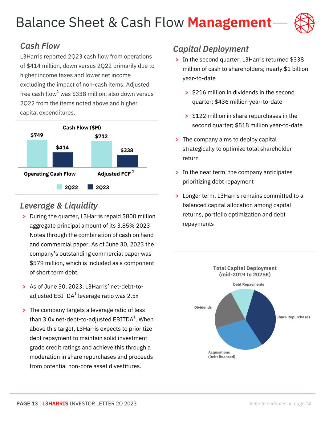PAGE 13 | L3HARRIS INVESTOR LETTER 2Q 2023 Refer to endnotes on page 14 Capital Deployment > In the second quarter, L3Harris returned $338 million of cash to shareholders; nearly $1 billion year-to-date > $216 million in dividends in the second quarter; $436 million year-to-date > $122 million in share repurchases in the second quarter; $518 million year-to-date > The company aims to deploy capital strategically to optimize total shareholder return > In the near term, the company anticipates prioritizing debt repayment > Longer term, L3Harris remains committed to a balanced capital allocation among capital returns, portfolio optimization and debt repayments Cash Flow L3Harris reported 2Q23 cash flow from operations of $414 million, down versus 2Q22 primarily due to higher income taxes and lower net income excluding the impact of non-cash items. Adjusted free cash flow1 was $338 million, also down versus 2Q22 from the items noted above and higher capital expenditures. Leverage & Liquidity > During the quarter, L3Harris repaid $800 million aggregate principal amount of its 3.85% 2023 Notes through the combination of cash on hand and commercial paper. As of June 30, 2023 the company’s outstanding commercial paper was $579 million, which is included as a component of short term debt. > As of June 30, 2023, L3Harris’ net-debt-to- adjusted EBITDA1 leverage ratio was 2.5x > The company targets a leverage ratio of less than 3.0x net-debt-to-adjusted EBITDA1. When above this target, L3Harris expects to prioritize debt repayment to maintain solid investment grade credit ratings and achieve this through a moderation in share repurchases and proceeds from potential non-core asset divestitures. Total Capital Deployment (mid-2019 to 2025E) Share Repurchases Acquisitions (Debt financed) Dividends Debt Repayments Balance Sheet & Cash Flow Management Cash Flow ($M) $749 $712 $414 $338 2Q22 2Q23 Operating Cash Flow Adjusted FCF 1