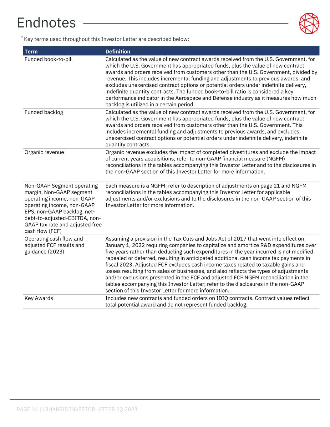 PAGE 14 | L3HARRIS INVESTOR LETTER 2Q 2023 1 Key terms used throughout this Investor Letter are described below: Term Definition Funded book-to-bill Calculated as the value of new contract awards received from the U.S. Government, for which the U.S. Government has appropriated funds, plus the value of new contract awards and orders received from customers other than the U.S. Government, divided by revenue. This includes incremental funding and adjustments to previous awards, and excludes unexercised contract options or potential orders under indefinite delivery, indefinite quantity contracts. The funded book-to-bill ratio is considered a key performance indicator in the Aerospace and Defense industry as it measures how much backlog is utilized in a certain period. Funded backlog Calculated as the value of new contract awards received from the U.S. Government, for which the U.S. Government has appropriated funds, plus the value of new contract awards and orders received from customers other than the U.S. Government. This includes incremental funding and adjustments to previous awards, and excludes unexercised contract options or potential orders under indefinite delivery, indefinite quantity contracts. Organic revenue Organic revenue excludes the impact of completed divestitures and exclude the impact of current years acquisitions; refer to non-GAAP financial measure (NGFM) reconciliations in the tables accompanying this Investor Letter and to the disclosures in the non-GAAP section of this Investor Letter for more information. Non-GAAP Segment operating margin, Non-GAAP segment operating income, non-GAAP operating income, non-GAAP EPS, non-GAAP backlog, net- debt-to-adjusted-EBITDA, non- GAAP tax rate and adjusted free cash flow (FCF) Each measure is a NGFM; refer to description of adjustments on page 21 and NGFM reconciliations in the tables accompanying this Investor Letter for applicable adjustments and/or exclusions and to the disclosures in the non-GAAP section of this Investor Letter for more information. Operating cash flow and adjusted FCF results and guidance (2023) Assuming a provision in the Tax Cuts and Jobs Act of 2017 that went into effect on January 1, 2022 requiring companies to capitalize and amortize R&D expenditures over five years rather than deducting such expenditures in the year incurred is not modified, repealed or deferred, resulting in anticipated additional cash income tax payments in fiscal 2023. Adjusted FCF excludes cash income taxes related to taxable gains and losses resulting from sales of businesses, and also reflects the types of adjustments and/or exclusions presented in the FCF and adjusted FCF NGFM reconciliation in the tables accompanying this Investor Letter; refer to the disclosures in the non-GAAP section of this Investor Letter for more information. Key Awards Includes new contracts and funded orders on IDIQ contracts. Contract values reflect total potential award and do not represent funded backlog. Endnotes