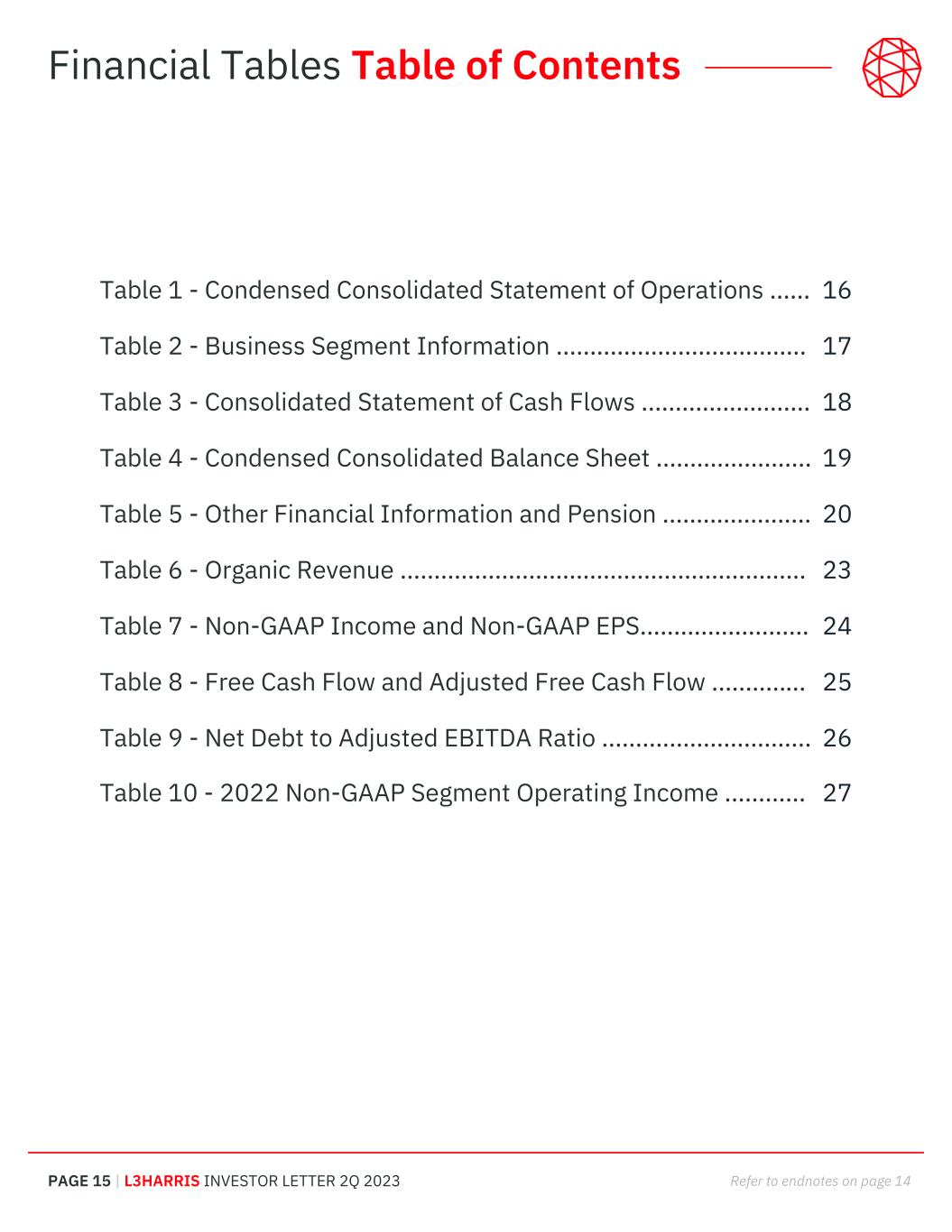 PAGE 15 | L3HARRIS INVESTOR LETTER 2Q 2023 Refer to endnotes on page 14 Table 1 - Condensed Consolidated Statement of Operations ...... 16 Table 2 - Business Segment Information ..................................... 17 Table 3 - Consolidated Statement of Cash Flows ......................... 18 Table 4 - Condensed Consolidated Balance Sheet ....................... 19 Table 5 - Other Financial Information and Pension ...................... 20 Table 6 - Organic Revenue ............................................................ 23 Table 7 - Non-GAAP Income and Non-GAAP EPS......................... 24 Table 8 - Free Cash Flow and Adjusted Free Cash Flow .............. 25 Table 9 - Net Debt to Adjusted EBITDA Ratio ............................... 26 Table 10 - 2022 Non-GAAP Segment Operating Income ............ 27 Financial Tables Table of Contents
