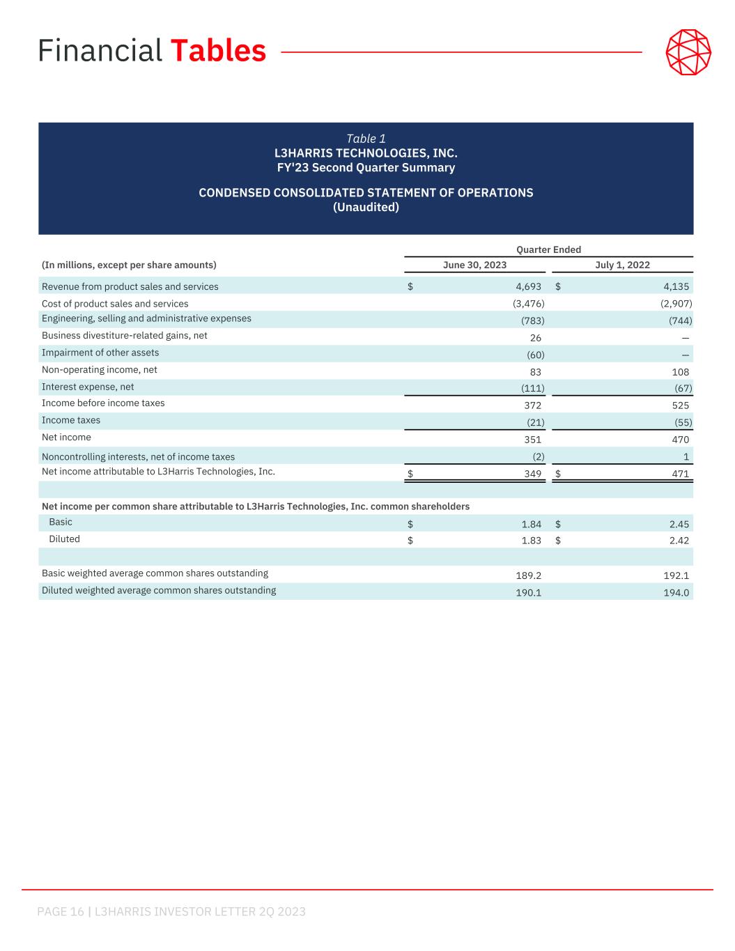 PAGE 16 | L3HARRIS INVESTOR LETTER 2Q 2023   Quarter Ended (In millions, except per share amounts) June 30, 2023 July 1, 2022 Revenue from product sales and services $ 4,693 $ 4,135 Cost of product sales and services (3,476) (2,907) Engineering, selling and administrative expenses (783) (744) Business divestiture-related gains, net 26 — Impairment of other assets (60) — Non-operating income, net 83 108 Interest expense, net (111) (67) Income before income taxes 372 525 Income taxes (21) (55) Net income 351 470 Noncontrolling interests, net of income taxes (2) 1 Net income attributable to L3Harris Technologies, Inc. $ 349 $ 471 Net income per common share attributable to L3Harris Technologies, Inc. common shareholders Basic $ 1.84 $ 2.45 Diluted $ 1.83 $ 2.42 Basic weighted average common shares outstanding 189.2 192.1 Diluted weighted average common shares outstanding 190.1 194.0 Table 1 L3HARRIS TECHNOLOGIES, INC. FY'23 Second Quarter Summary CONDENSED CONSOLIDATED STATEMENT OF OPERATIONS (Unaudited) support Financial Tables