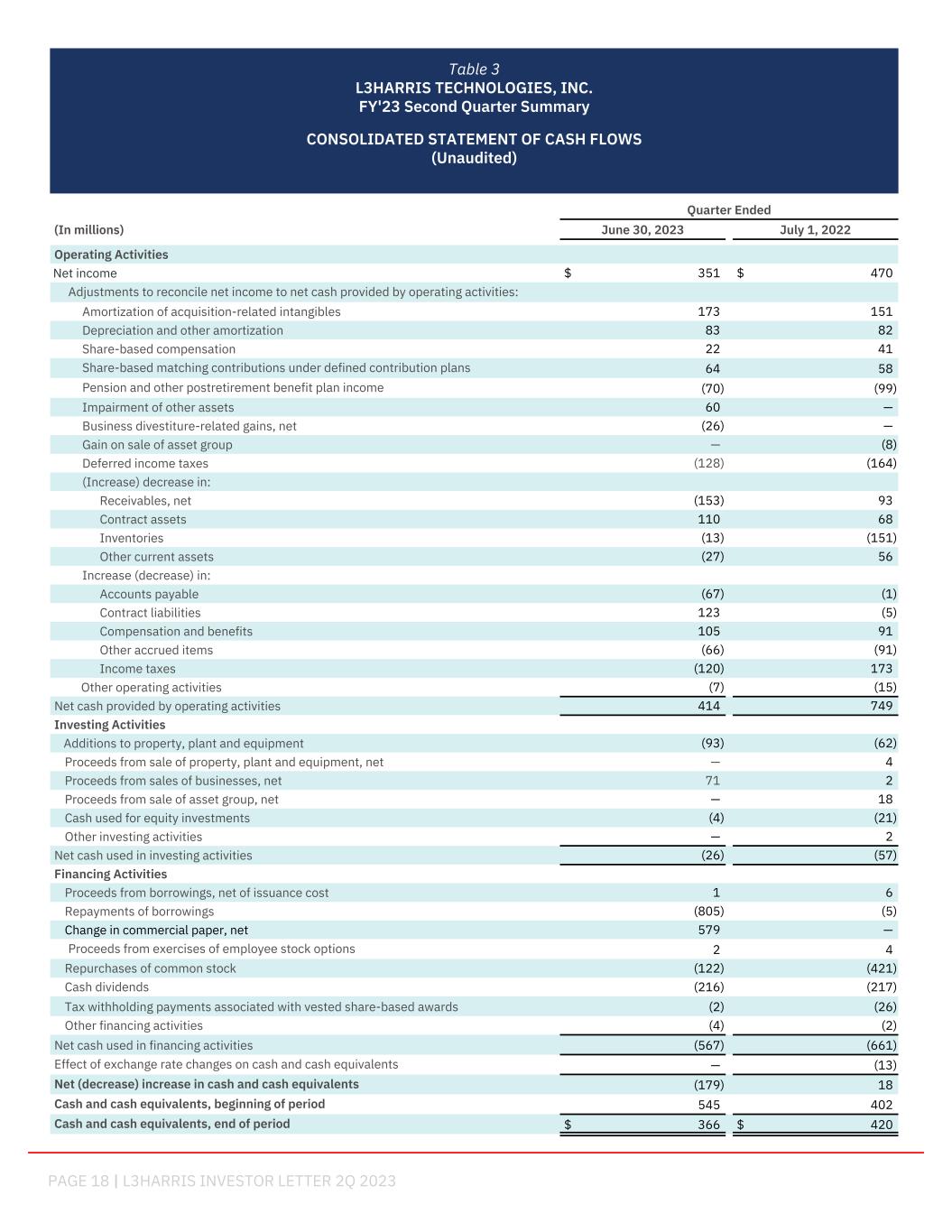 PAGE 18 | L3HARRIS INVESTOR LETTER 2Q 2023   Quarter Ended (In millions) June 30, 2023 July 1, 2022 Operating Activities Net income $ 351 $ 470 Adjustments to reconcile net income to net cash provided by operating activities: Amortization of acquisition-related intangibles 173 151 Depreciation and other amortization 83 82 Share-based compensation 22 41 Share-based matching contributions under defined contribution plans 64 58 Pension and other postretirement benefit plan income (70) (99) Impairment of other assets 60 — Business divestiture-related gains, net (26) — Gain on sale of asset group — (8) Deferred income taxes (128) (164) (Increase) decrease in: Receivables, net (153) 93 Contract assets 110 68 Inventories (13) (151) Other current assets (27) 56 Increase (decrease) in: Accounts payable (67) (1) Contract liabilities 123 (5) Compensation and benefits 105 91 Other accrued items (66) (91) Income taxes (120) 173 Other operating activities (7) (15) Net cash provided by operating activities 414 749 Investing Activities Additions to property, plant and equipment (93) (62) Proceeds from sale of property, plant and equipment, net — 4 Proceeds from sales of businesses, net 71 2 Proceeds from sale of asset group, net — 18 Cash used for equity investments (4) (21) Other investing activities — 2 Net cash used in investing activities (26) (57) Financing Activities Proceeds from borrowings, net of issuance cost 1 6 Repayments of borrowings (805) (5) Change in commercial paper, net 579 — Proceeds from exercises of employee stock options 2 4 Repurchases of common stock (122) (421) Cash dividends (216) (217) Tax withholding payments associated with vested share-based awards (2) (26) Other financing activities (4) (2) Net cash used in financing activities (567) (661) Effect of exchange rate changes on cash and cash equivalents — (13) Net (decrease) increase in cash and cash equivalents (179) 18 Cash and cash equivalents, beginning of period 545 402 Cash and cash equivalents, end of period $ 366 $ 420 Table 3 L3HARRIS TECHNOLOGIES, INC. FY'23 Second Quarter Summary CONSOLIDATED STATEMENT OF CASH FLOWS (Unaudited) support