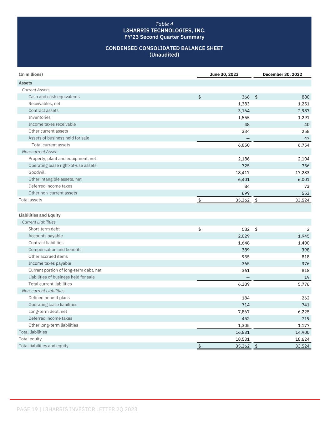 PAGE 19 | L3HARRIS INVESTOR LETTER 2Q 2023 (In millions) June 30, 2023 December 30, 2022 Assets Current Assets Cash and cash equivalents $ 366 $ 880 Receivables, net 1,383 1,251 Contract assets 3,164 2,987 Inventories 1,555 1,291 Income taxes receivable 48 40 Other current assets 334 258 Assets of business held for sale — 47 Total current assets 6,850 6,754 Non-current Assets Property, plant and equipment, net 2,186 2,104 Operating lease right-of-use assets 725 756 Goodwill 18,417 17,283 Other intangible assets, net 6,401 6,001 Deferred income taxes 84 73 Other non-current assets 699 553 Total assets $ 35,362 $ 33,524 Liabilities and Equity Current Liabilities Short-term debt $ 582 $ 2 Accounts payable 2,029 1,945 Contract liabilities 1,648 1,400 Compensation and benefits 389 398 Other accrued items 935 818 Income taxes payable 365 376 Current portion of long-term debt, net 361 818 Liabilities of business held for sale — 19 Total current liabilities 6,309 5,776 Non-current Liabilities Defined benefit plans 184 262 Operating lease liabilities 714 741 Long-term debt, net 7,867 6,225 Deferred income taxes 452 719 Other long-term liabilities 1,305 1,177 Total liabilities 16,831 14,900 Total equity 18,531 18,624 Total liabilities and equity $ 35,362 $ 33,524 Table 4 L3HARRIS TECHNOLOGIES, INC. FY'23 Second Quarter Summary CONDENSED CONSOLIDATED BALANCE SHEET (Unaudited) support