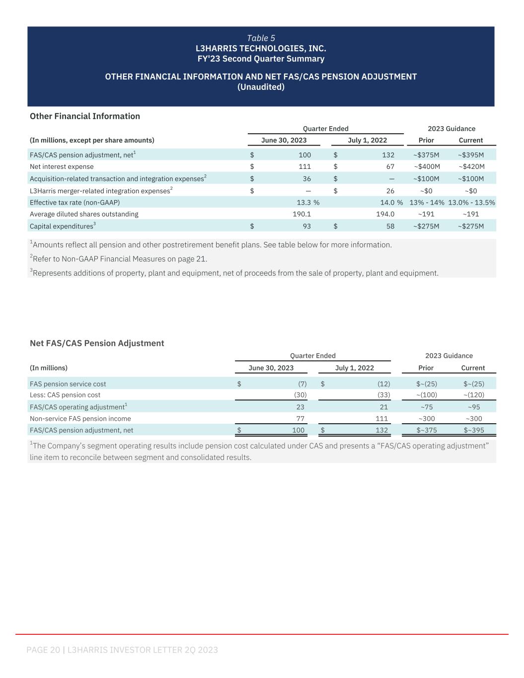 PAGE 20 | L3HARRIS INVESTOR LETTER 2Q 2023 Net FAS/CAS Pension Adjustment Quarter Ended 2023 Guidance (In millions) June 30, 2023 July 1, 2022 Prior Current FAS pension service cost $ (7) $ (12) $~(25) $~(25) Less: CAS pension cost (30) (33) ~(100) ~(120) FAS/CAS operating adjustment1 23 21 ~75 ~95 Non-service FAS pension income 77 111 ~300 ~300 FAS/CAS pension adjustment, net $ 100 $ 132 $~375 $~395 1The Company’s segment operating results include pension cost calculated under CAS and presents a “FAS/CAS operating adjustment” line item to reconcile between segment and consolidated results. Other Financial Information Quarter Ended 2023 Guidance (In millions, except per share amounts) June 30, 2023 July 1, 2022 Prior Current FAS/CAS pension adjustment, net1 $ 100 $ 132 ~$375M ~$395M Net interest expense $ 111 $ 67 ~$400M ~$420M Acquisition-related transaction and integration expenses2 $ 36 $ — ~$100M ~$100M L3Harris merger-related integration expenses2 $ — $ 26 ~$0 ~$0 Effective tax rate (non-GAAP) 13.3 % 14.0 % 13% - 14% 13.0% - 13.5% Average diluted shares outstanding 190.1 194.0 ~191 ~191 Capital expenditures3 $ 93 $ 58 ~$275M ~$275M 1Amounts reflect all pension and other postretirement benefit plans. See table below for more information. 2Refer to Non-GAAP Financial Measures on page 21. 3Represents additions of property, plant and equipment, net of proceeds from the sale of property, plant and equipment. Table 5 L3HARRIS TECHNOLOGIES, INC. FY'23 Second Quarter Summary OTHER FINANCIAL INFORMATION AND NET FAS/CAS PENSION ADJUSTMENT (Unaudited) support