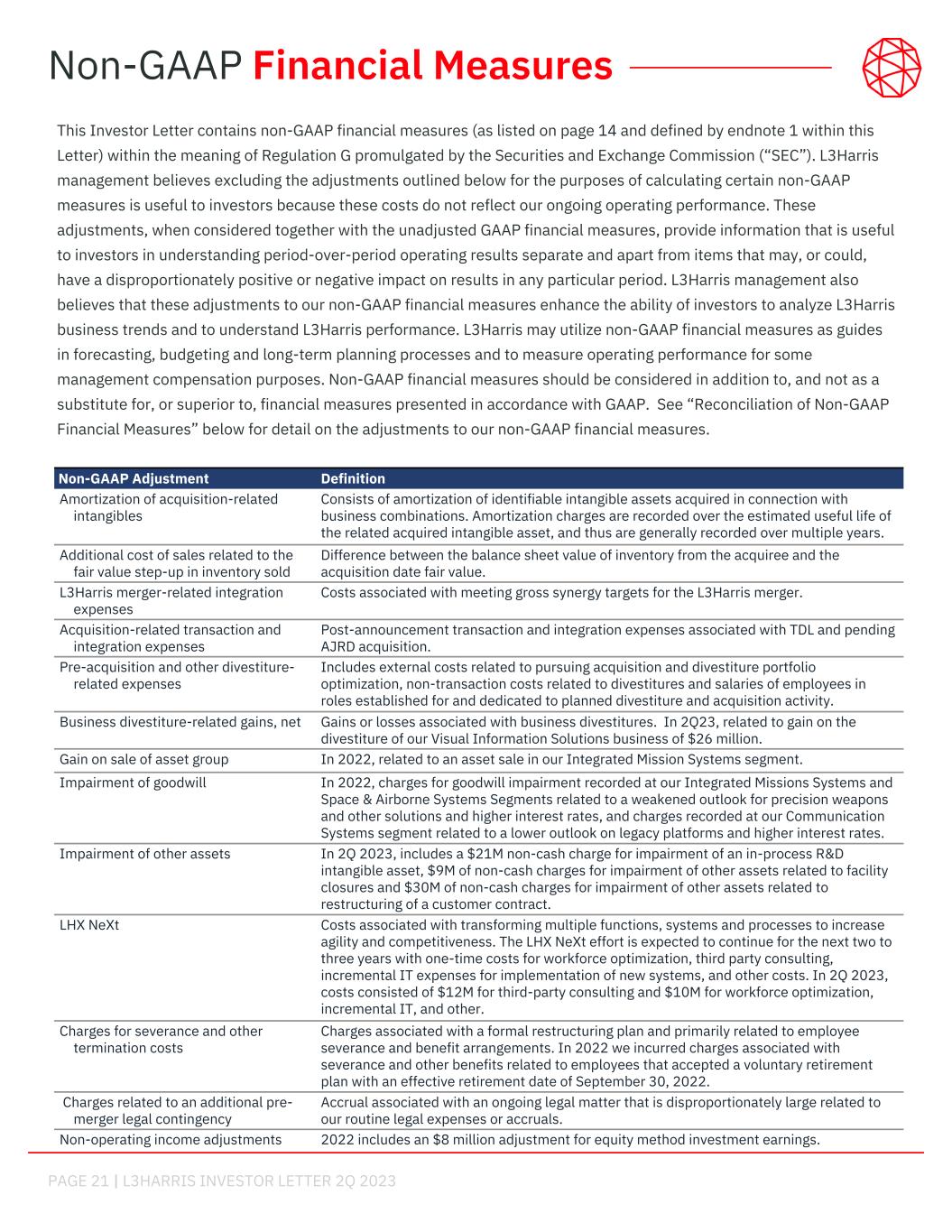 PAGE 21 | L3HARRIS INVESTOR LETTER 2Q 2023 Non-GAAP Adjustment Definition Amortization of acquisition-related intangibles Consists of amortization of identifiable intangible assets acquired in connection with business combinations. Amortization charges are recorded over the estimated useful life of the related acquired intangible asset, and thus are generally recorded over multiple years. Additional cost of sales related to the fair value step-up in inventory sold Difference between the balance sheet value of inventory from the acquiree and the acquisition date fair value. L3Harris merger-related integration expenses Costs associated with meeting gross synergy targets for the L3Harris merger. Acquisition-related transaction and integration expenses Post-announcement transaction and integration expenses associated with TDL and pending AJRD acquisition. Pre-acquisition and other divestiture- related expenses Includes external costs related to pursuing acquisition and divestiture portfolio optimization, non-transaction costs related to divestitures and salaries of employees in roles established for and dedicated to planned divestiture and acquisition activity. Business divestiture-related gains, net Gains or losses associated with business divestitures. In 2Q23, related to gain on the divestiture of our Visual Information Solutions business of $26 million. Gain on sale of asset group In 2022, related to an asset sale in our Integrated Mission Systems segment. Impairment of goodwill In 2022, charges for goodwill impairment recorded at our Integrated Missions Systems and Space & Airborne Systems Segments related to a weakened outlook for precision weapons and other solutions and higher interest rates, and charges recorded at our Communication Systems segment related to a lower outlook on legacy platforms and higher interest rates. Impairment of other assets In 2Q 2023, includes a $21M non-cash charge for impairment of an in-process R&D intangible asset, $9M of non-cash charges for impairment of other assets related to facility closures and $30M of non-cash charges for impairment of other assets related to restructuring of a customer contract. LHX NeXt Costs associated with transforming multiple functions, systems and processes to increase agility and competitiveness. The LHX NeXt effort is expected to continue for the next two to three years with one-time costs for workforce optimization, third party consulting, incremental IT expenses for implementation of new systems, and other costs. In 2Q 2023, costs consisted of $12M for third-party consulting and $10M for workforce optimization, incremental IT, and other. Charges for severance and other termination costs Charges associated with a formal restructuring plan and primarily related to employee severance and benefit arrangements. In 2022 we incurred charges associated with severance and other benefits related to employees that accepted a voluntary retirement plan with an effective retirement date of September 30, 2022. Charges related to an additional pre- merger legal contingency Accrual associated with an ongoing legal matter that is disproportionately large related to our routine legal expenses or accruals. Non-operating income adjustments 2022 includes an $8 million adjustment for equity method investment earnings. This Investor Letter contains non-GAAP financial measures (as listed on page 14 and defined by endnote 1 within this Letter) within the meaning of Regulation G promulgated by the Securities and Exchange Commission (“SEC”). L3Harris management believes excluding the adjustments outlined below for the purposes of calculating certain non-GAAP measures is useful to investors because these costs do not reflect our ongoing operating performance. These adjustments, when considered together with the unadjusted GAAP financial measures, provide information that is useful to investors in understanding period-over-period operating results separate and apart from items that may, or could, have a disproportionately positive or negative impact on results in any particular period. L3Harris management also believes that these adjustments to our non-GAAP financial measures enhance the ability of investors to analyze L3Harris business trends and to understand L3Harris performance. L3Harris may utilize non-GAAP financial measures as guides in forecasting, budgeting and long-term planning processes and to measure operating performance for some management compensation purposes. Non-GAAP financial measures should be considered in addition to, and not as a substitute for, or superior to, financial measures presented in accordance with GAAP. See “Reconciliation of Non-GAAP Financial Measures” below for detail on the adjustments to our non-GAAP financial measures. Non-GAAP Financial Measures
